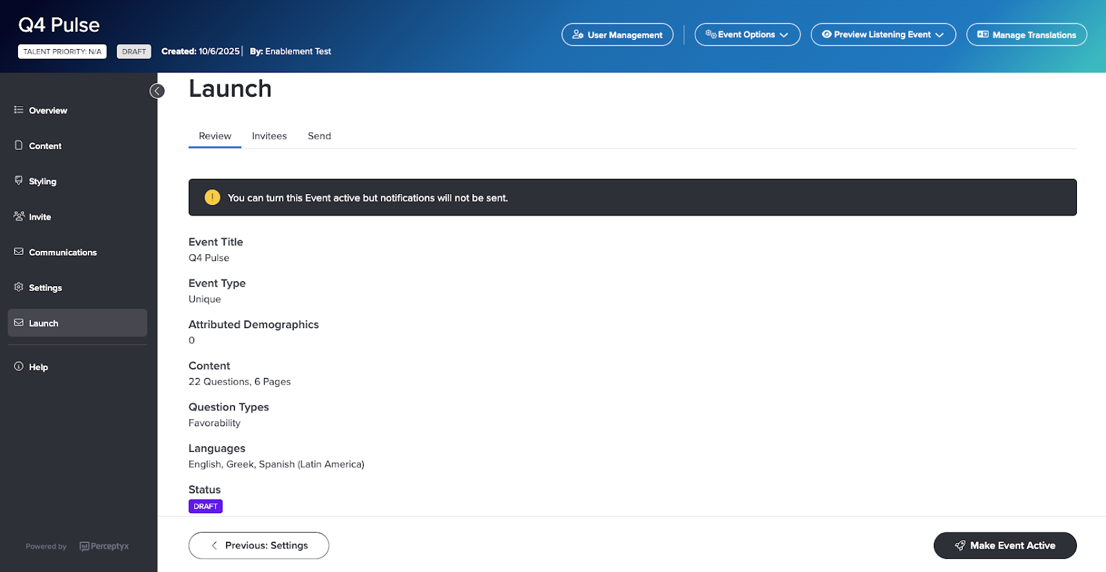 Review the details for your event, then click Make Event Active (bottom right).