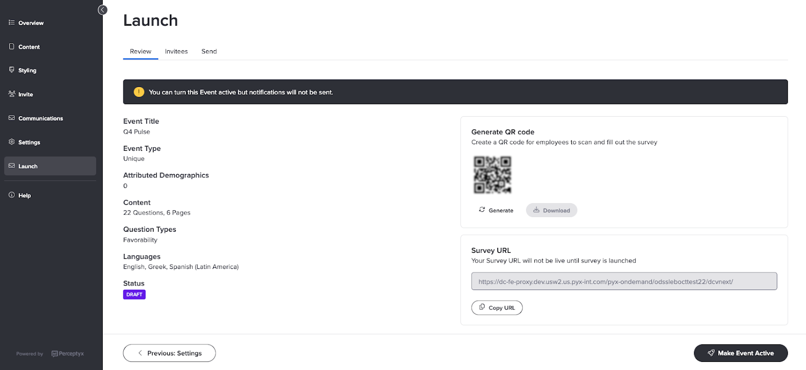 After adding participants to your event and configuring event settings, you are ready to move to the Launch phase. This phase includes making the event active and creating and scheduling notifications (invites and/or reminders). If you are using a PIN page to access your event, this is also the time you can generate a QR code and/or distribute the URL.
