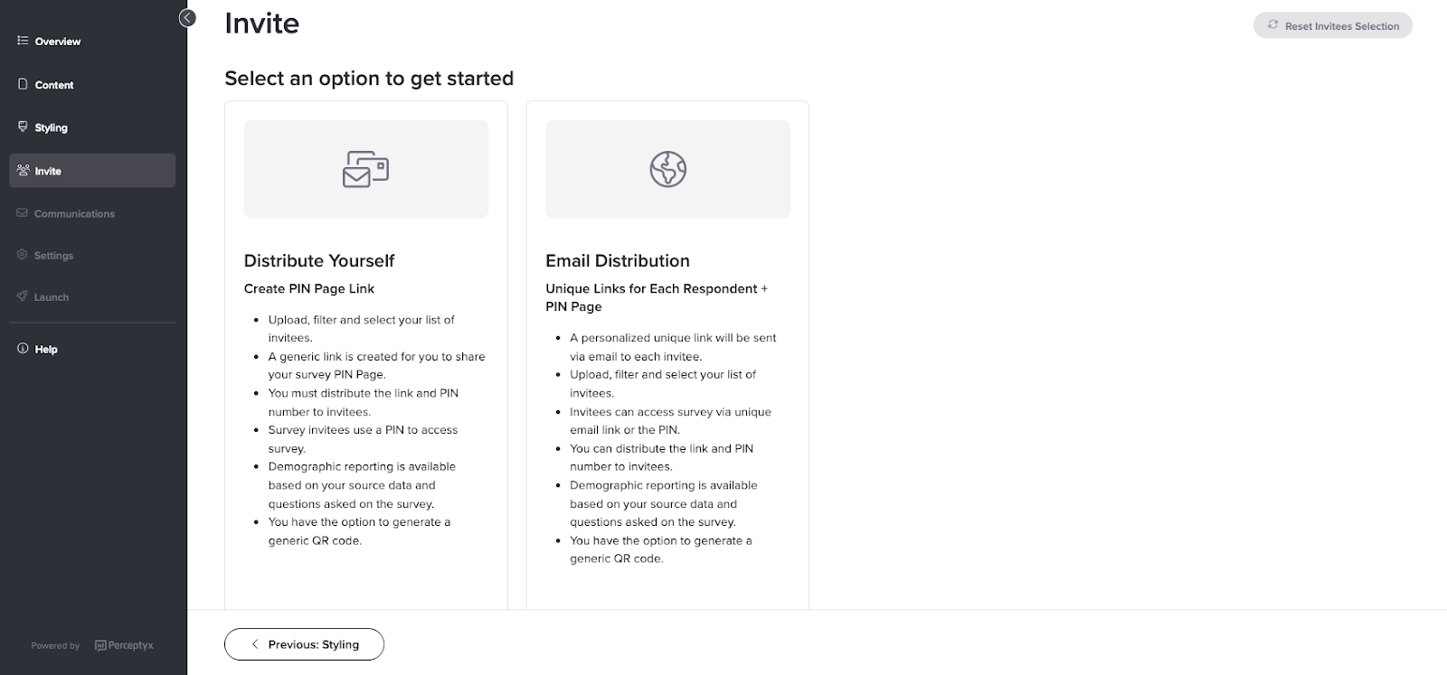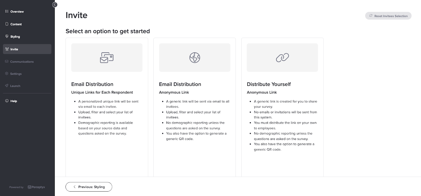 This option creates a generic link for you to share internally. No Perceptyx email communications are sent from the platform. You cannot load demographics when using this option as survey responses are anonymous and not attributed to individual respondents or any pre-loaded demographic data. Demographic reporting is available only if you add self-select demographic questions to your event during the Content phase.