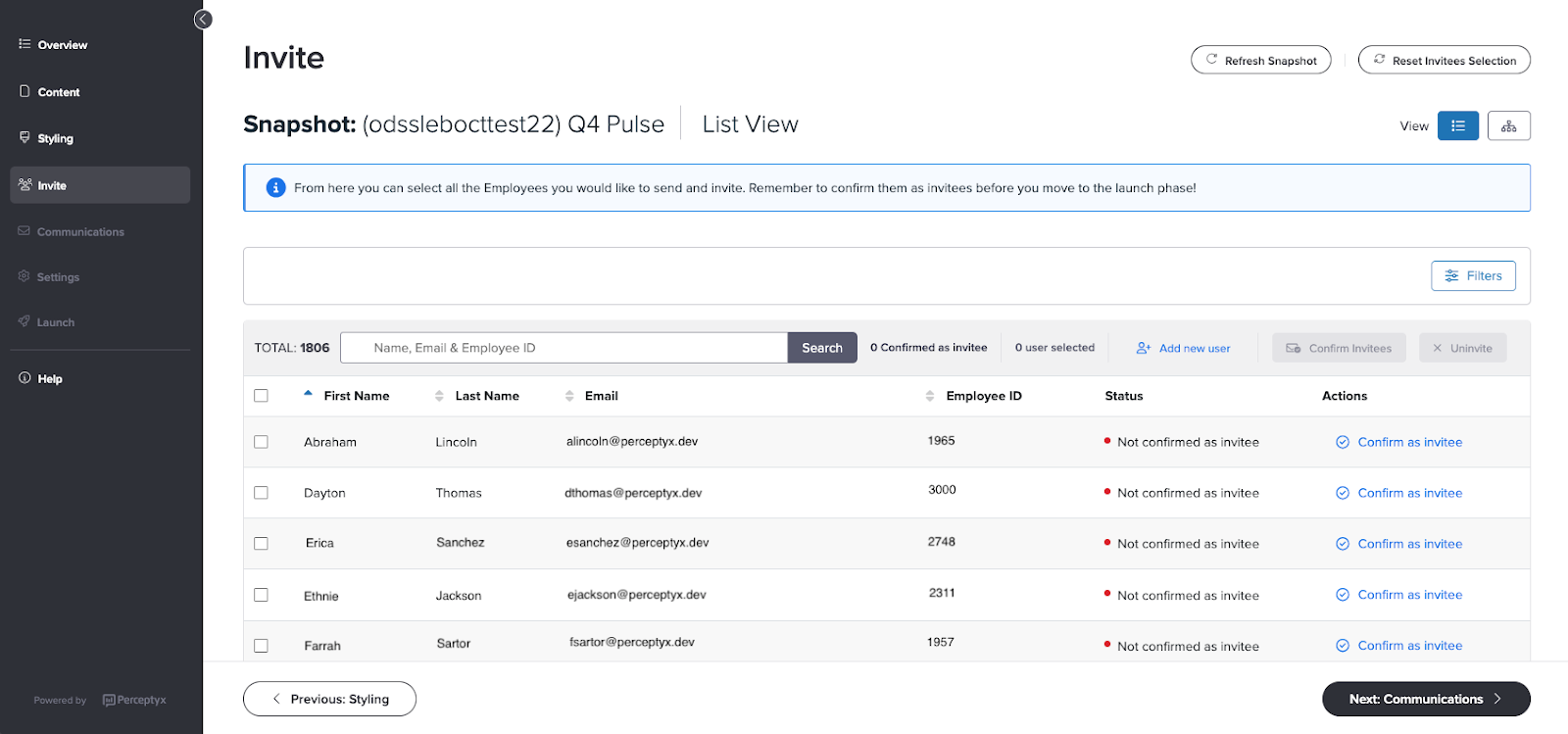 List View: Displays a table listing all employees from your automated data feed. You can apply filters to focus on specific employees or groups and add them as invitees to the event.