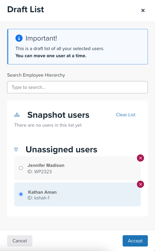 Although you can move only one employee at a time, you can select multiple employees and add them to a Draft List, which reduces the need to repeatedly switch between the Unassigned Employees tab and the Hierarchy tab.
