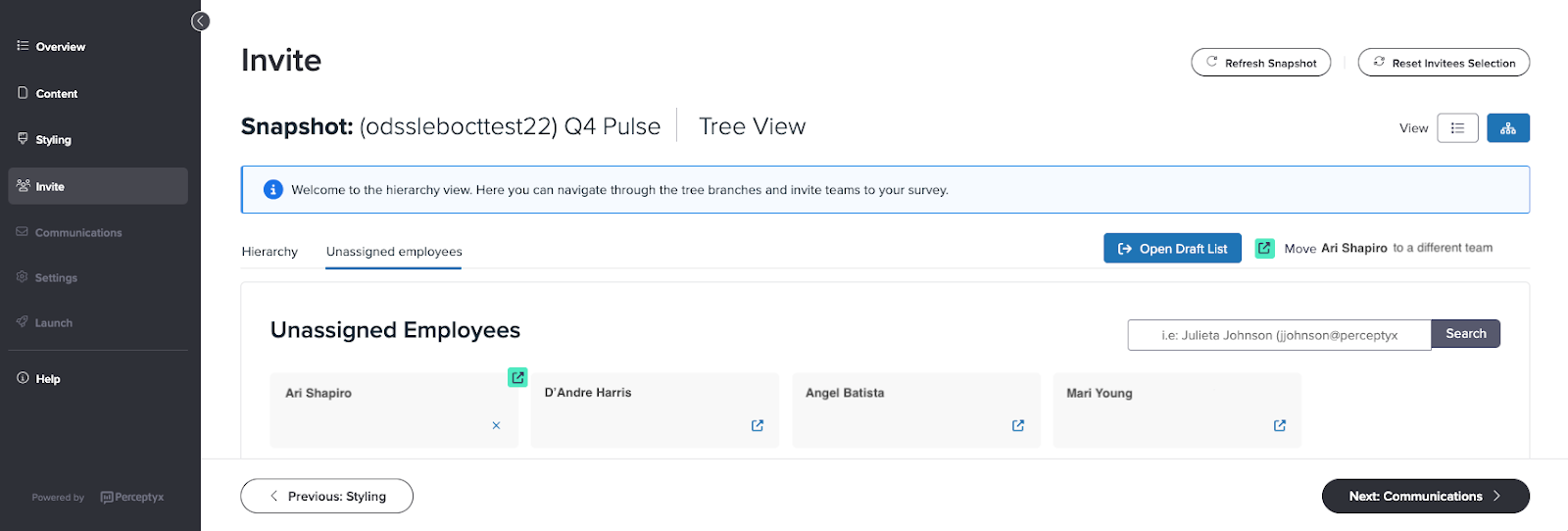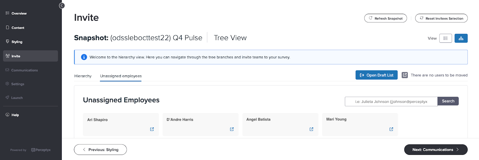 Hierarchy View: Displays the organizational hierarchy in a tree view, where you can manage the hierarchy and invite individuals and groups to the event. You can also assign any unassigned employees to their appropriate place in the hierarchy. We strongly encourage assignment of unassigned employees for optimal reporting accuracy.