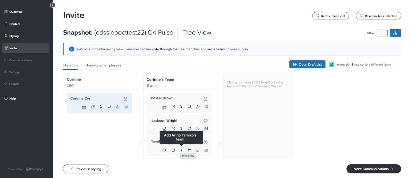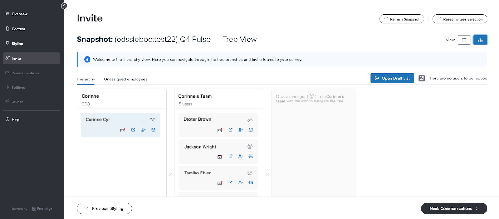 Note: This option is available only to customers on the Perceptyx Platform that have an automated data feed aligned to Perceptyx data specifications. The Manager Hierarchy feature needs to be enabled by the Perceptyx team. The process may take up to 3 business days, and must be completed before event creation.