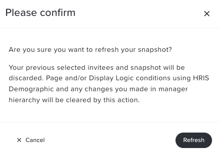 Important: When you refresh your snapshot, your previously selected invitees and snapshot are discarded, along with any changes you made in the Manager Hierarchy. Any page or display logic based on demographics from your HRIS file are also discarded.