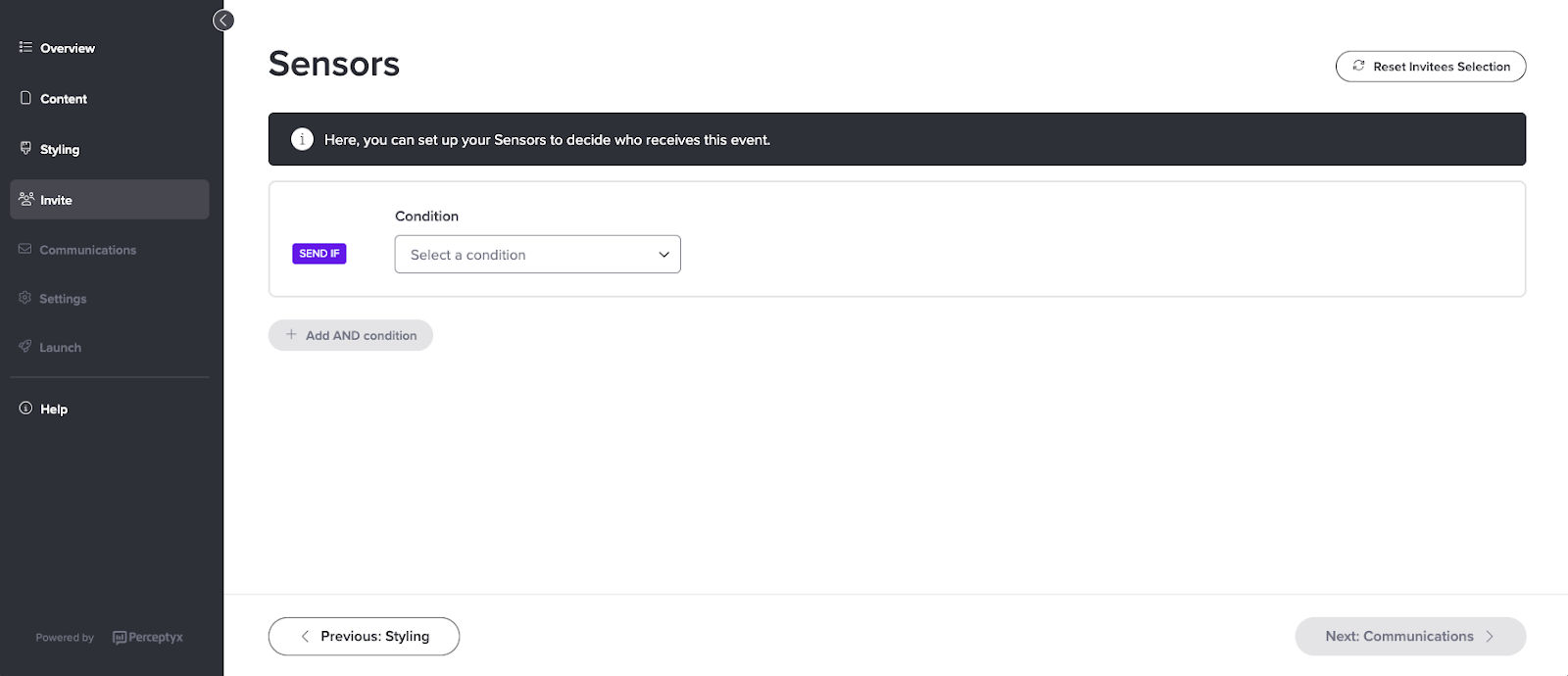 Add more conditions, if necessary, then click Next: Communications to move to the Communications phase.