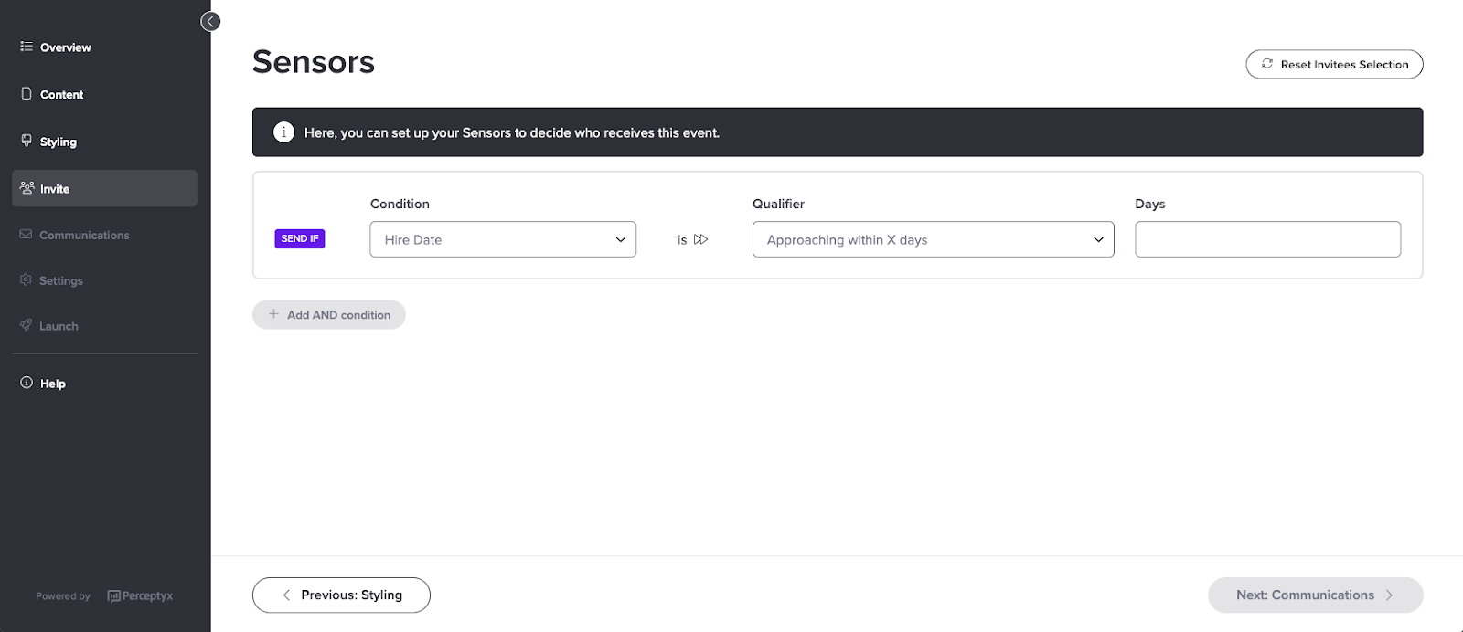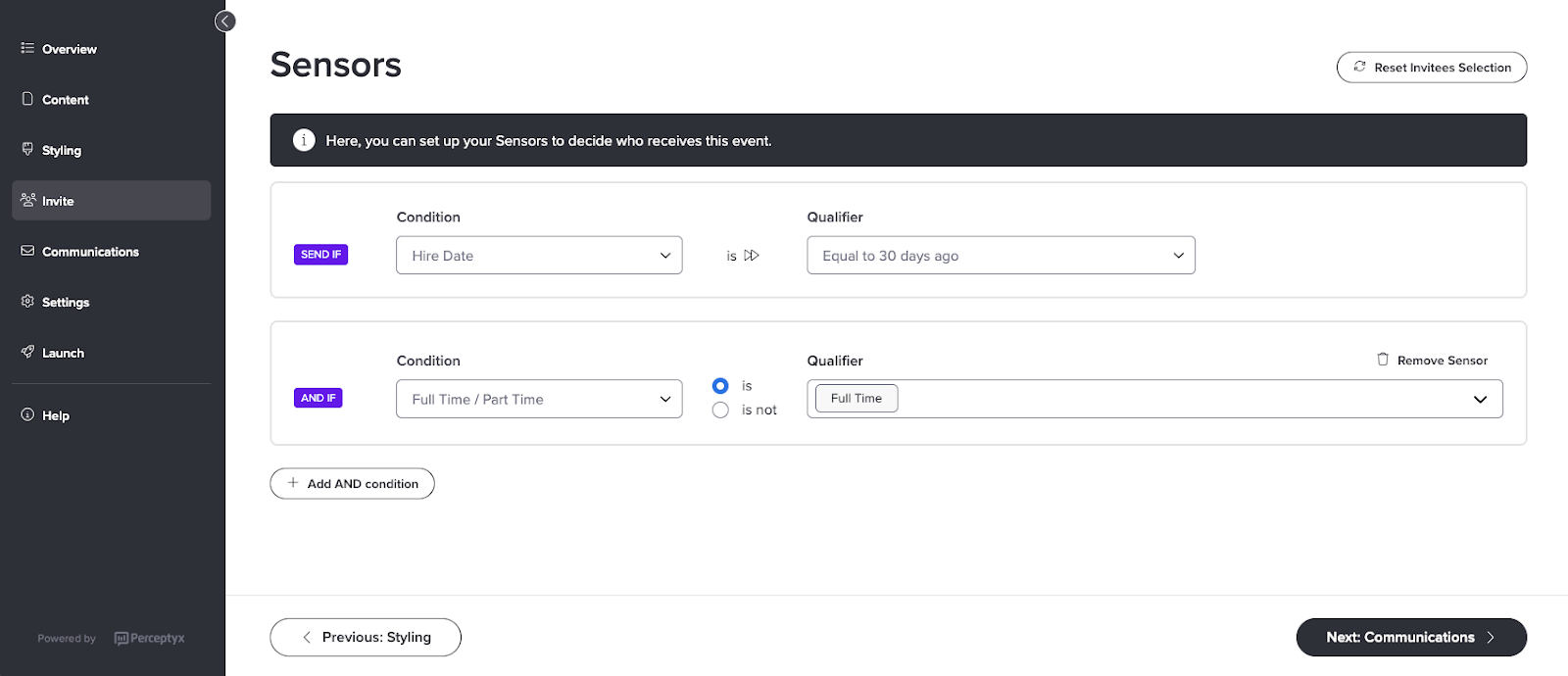 Sensors are conditions that trigger the sending of an invite, for example a hire or termination date. You specify a qualifier, such as “approaching in X days” or “equal to 30 days ago” to give the platform a condition for sending an invite. As your automated data feed updates, the platform sends invites to employees whose information meets the condition(s).