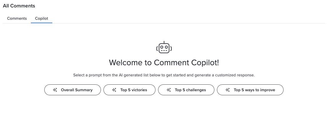 Comment Copilot is an optional feature that must be enabled for your company and for the listening event you are working with. If you don’t see a Comment Copilot tab, check with your Platform Administrator to determine if it has been disabled for your listening event.