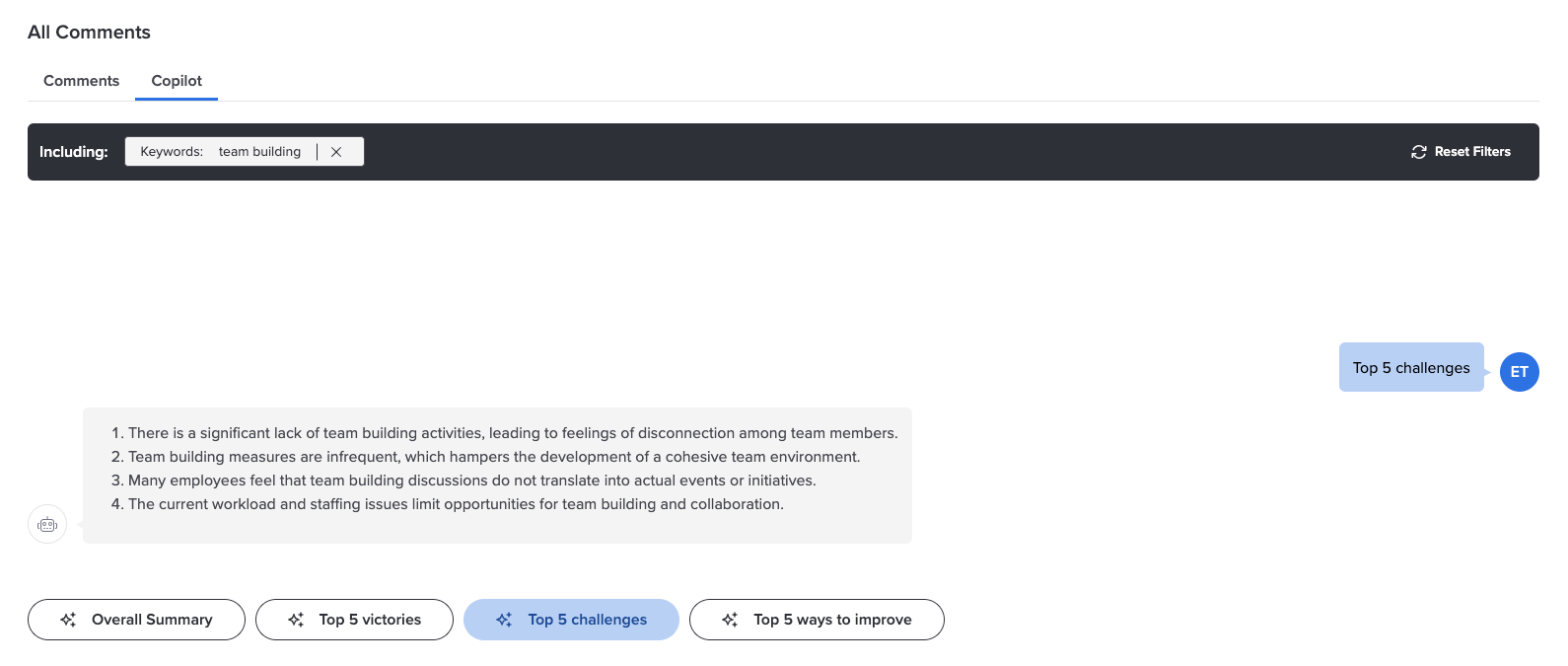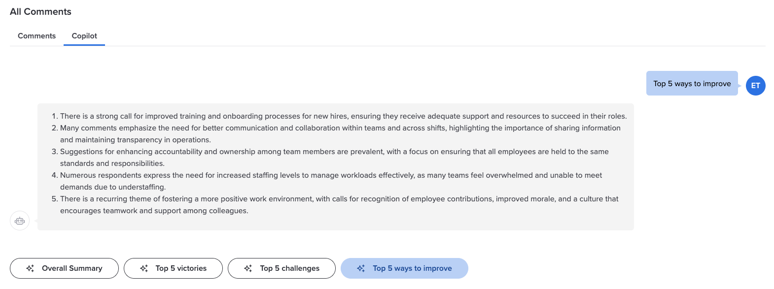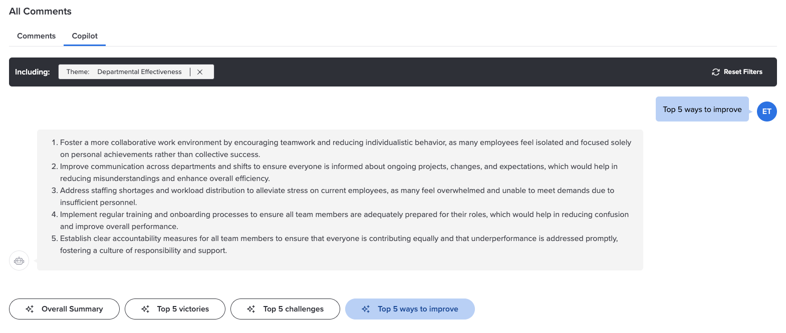 You can first apply a theme filter and/or keyword searches to the comments and then click a prompt to return summaries for the resulting subset of comments - for example, Top 5 ways to improve departmental effectiveness, an overall summary about benefits in specific divisions, etc.
