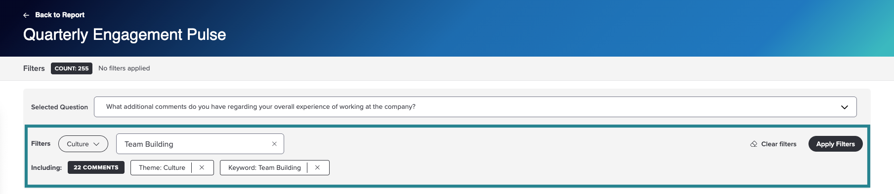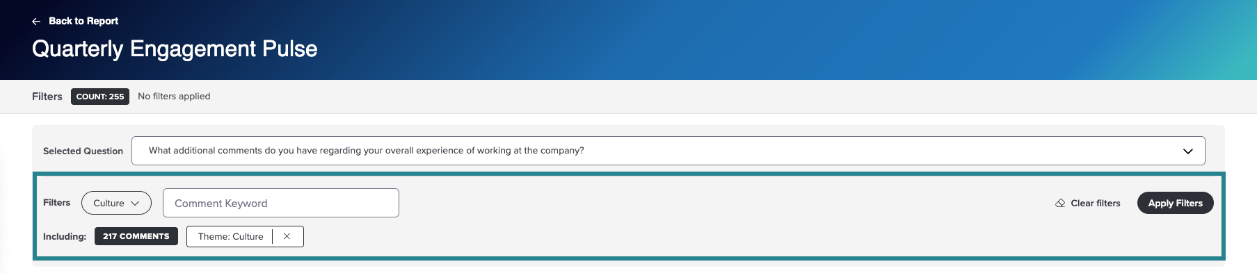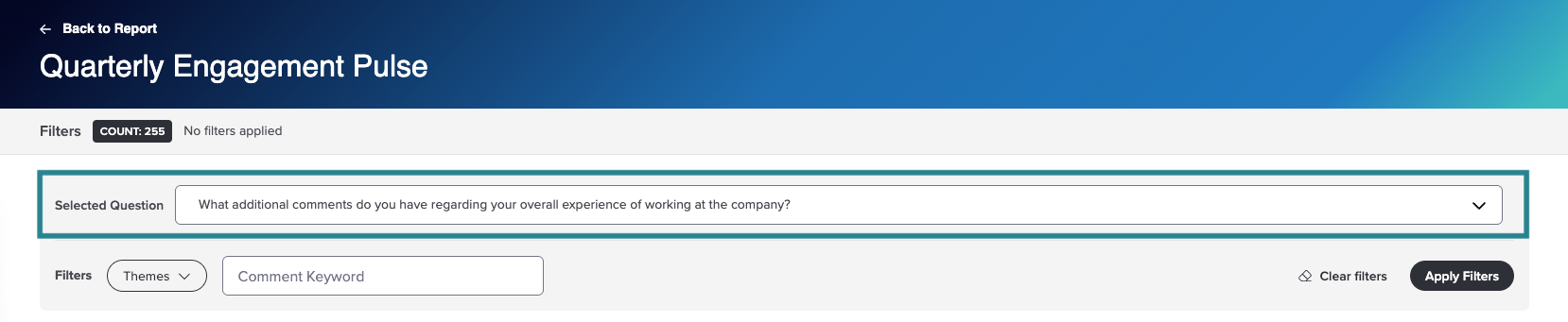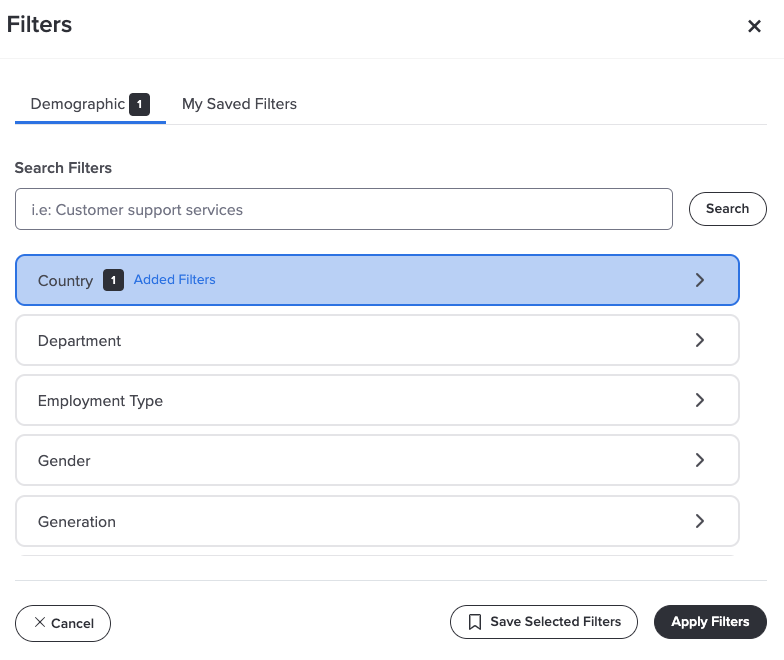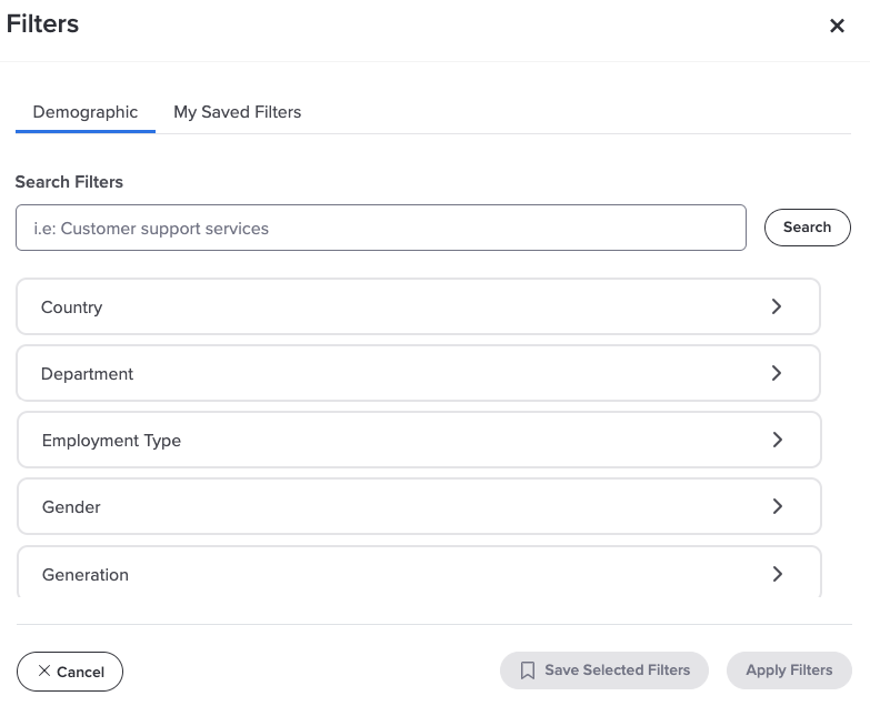 You can use demographic filters to analyze comment data across your entire population or focus on specific groups. This allows you to uncover patterns, differences, or concerns unique to certain roles, locations, departments, and more.