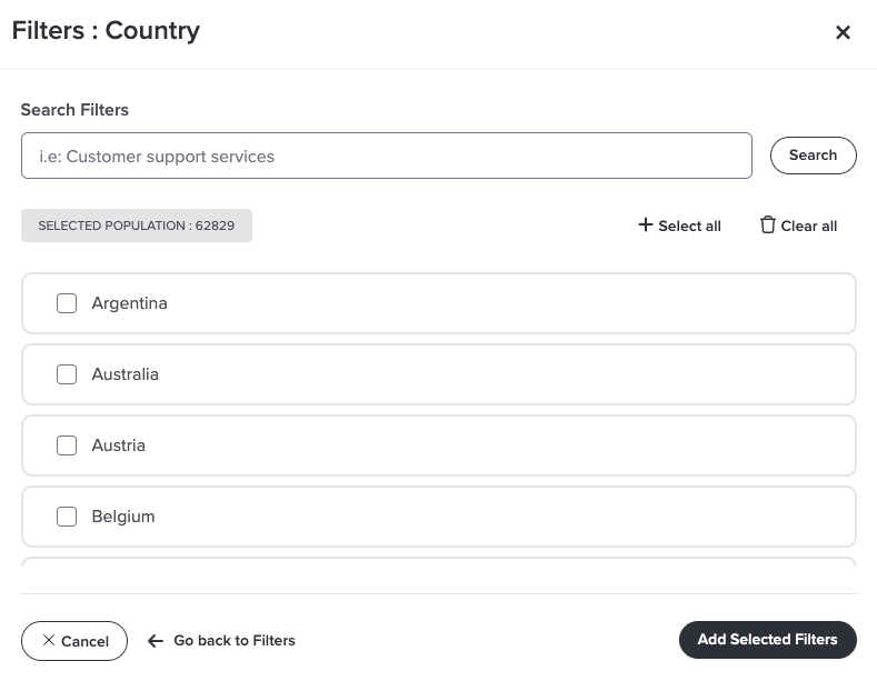 The Filters dialog box appears. You can select one or more demographics to create a filter. You can also use the Search Filters box to search for a specific demographic.