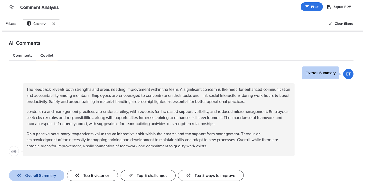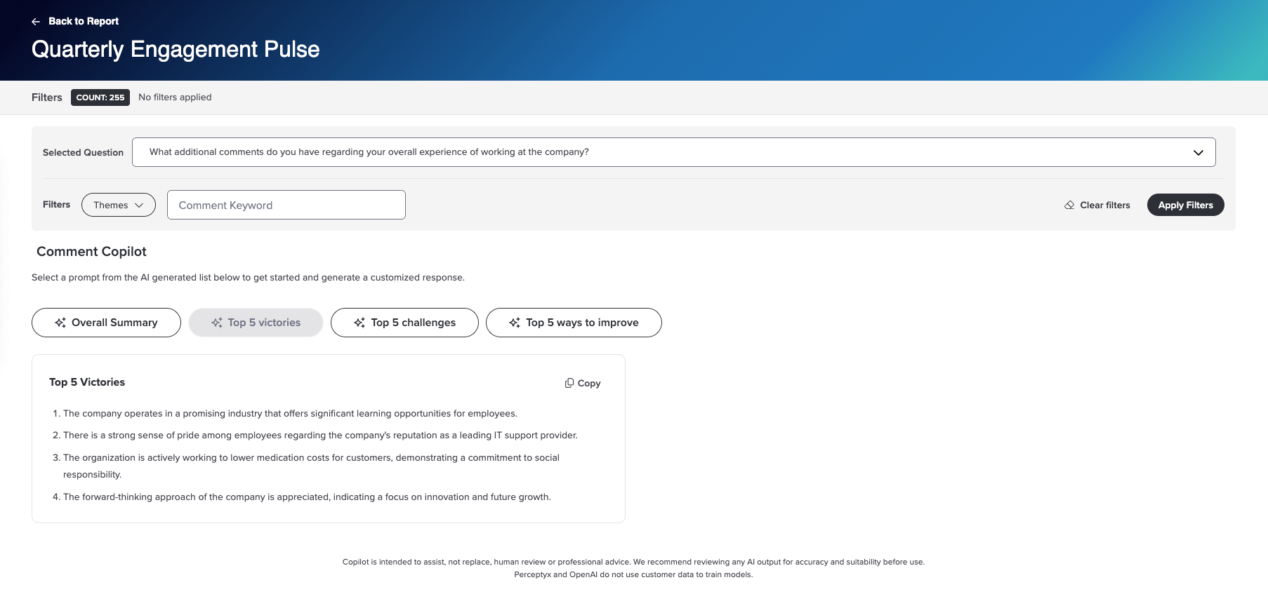 Comment Copilot leverages the power of OpenAI to quickly summarize employee comment feedback. It is limited to four predefined prompts set by Perceptyx, which deliver high-level summaries of key victories, challenges, and areas for improvement, helping fast-track your action-taking process.