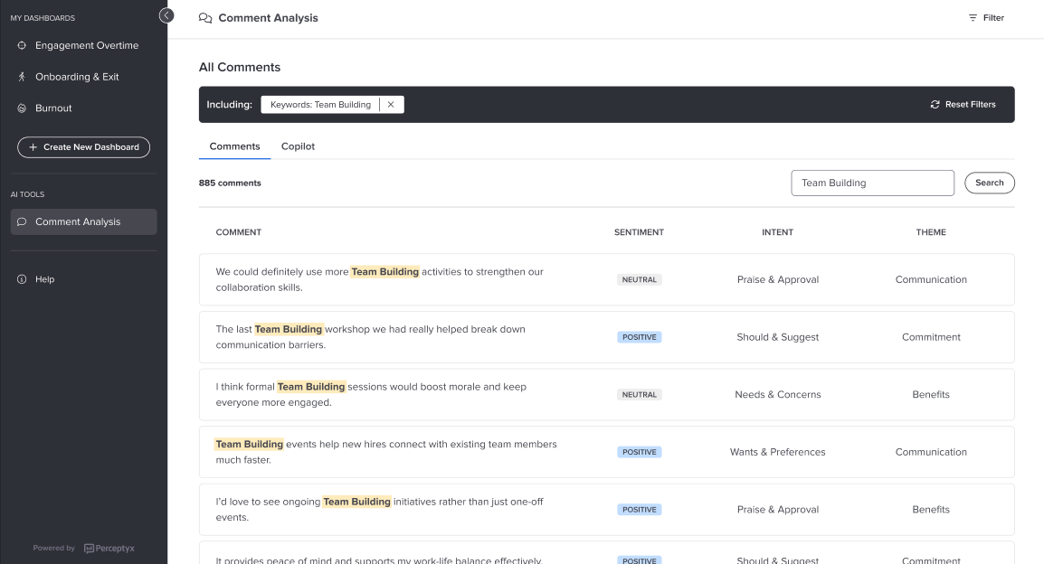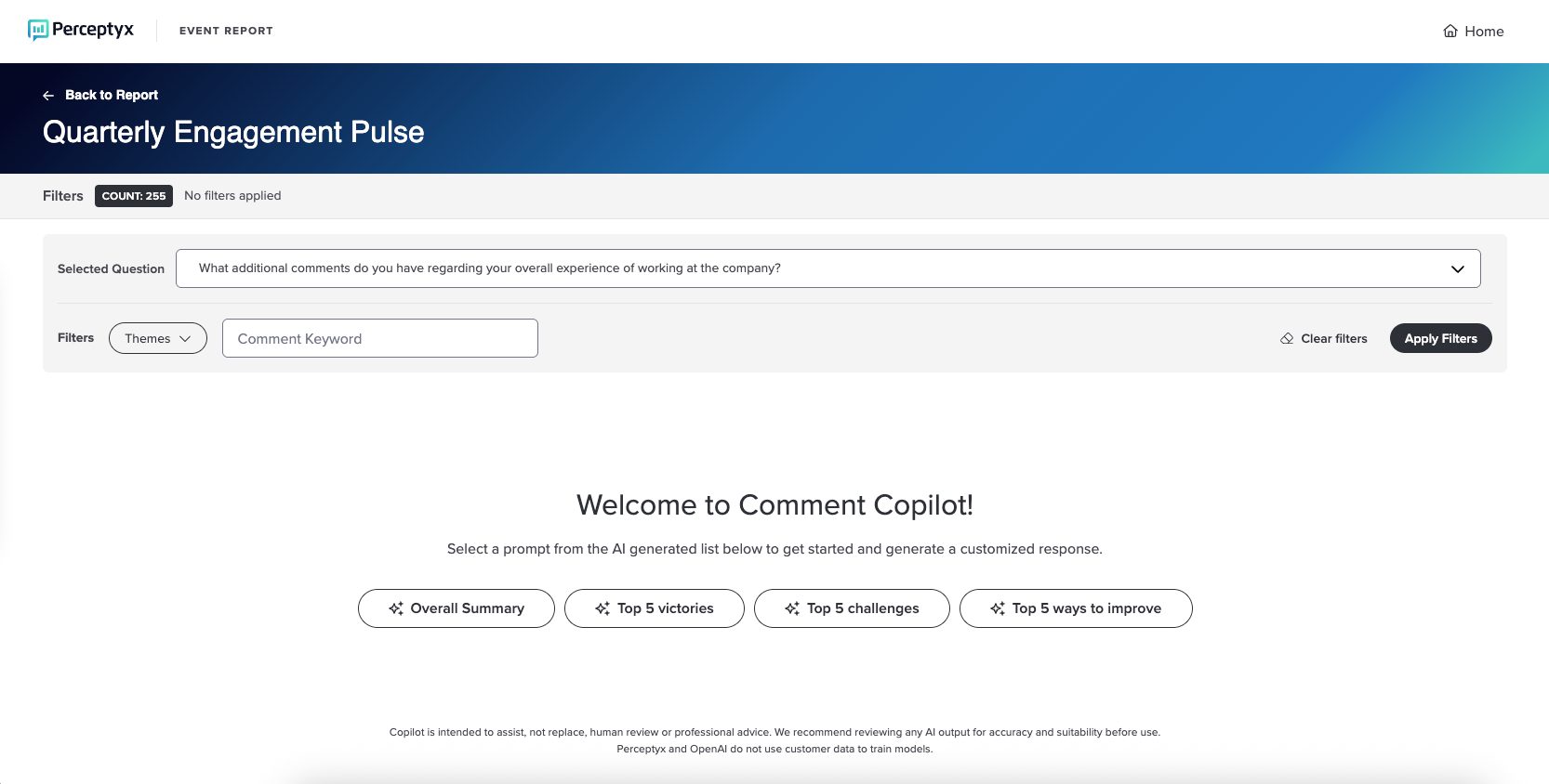 Note: Comment Copilot uses generative AI, which leverages OpenAI. When data is sent to OpenAI for analysis, only the comment text itself is shared, no demographic details, client IDs, or any other metadata are transmitted. For details about our approach to generative AI, please see the Perceptyx Perspective on Artificial Intelligence, Machine Learning, Natural Language Processing, and Generative AI article. Please note that Perceptyx does not train on customer data.