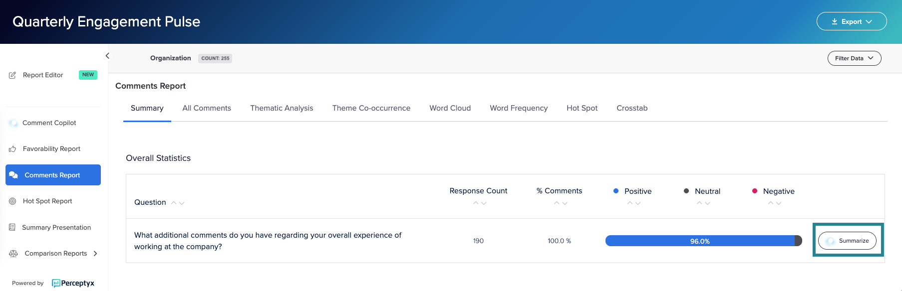 Important: Comment Copilot is an optional feature that must be enabled by Perceptyx at the subscription level. If it needs to be enabled for your company, your Platform Administrator should contact the Perceptyx Customer Success Manager.