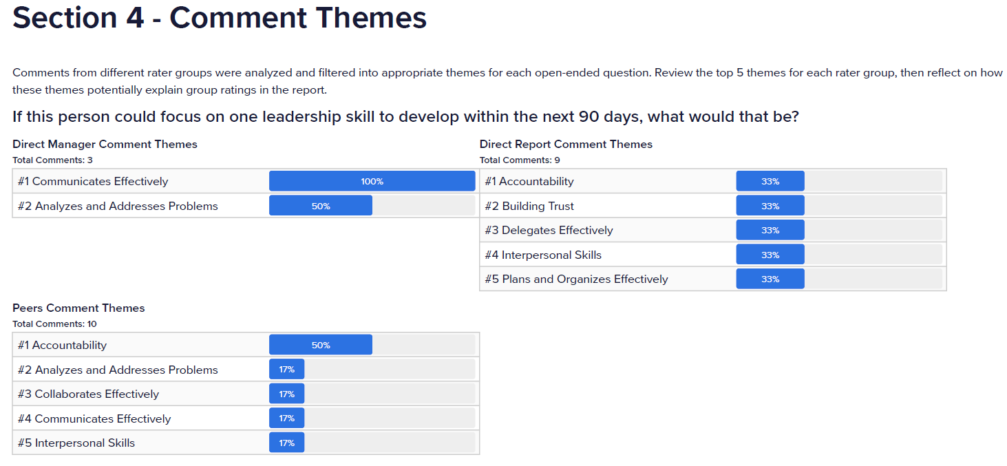 This section shows comments from different rater groups analyzed and filtered into appropriate themes for each open-ended question. You can review the themes for each rater group, then reflect on how these themes potentially explain group ratings in the report.