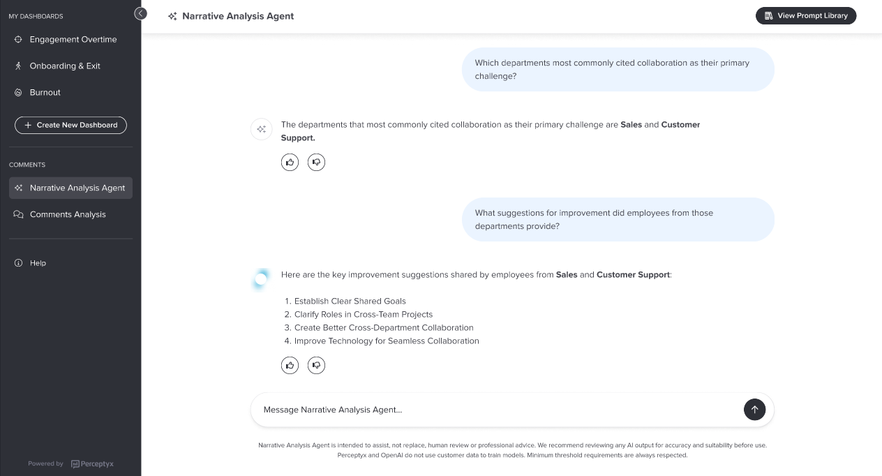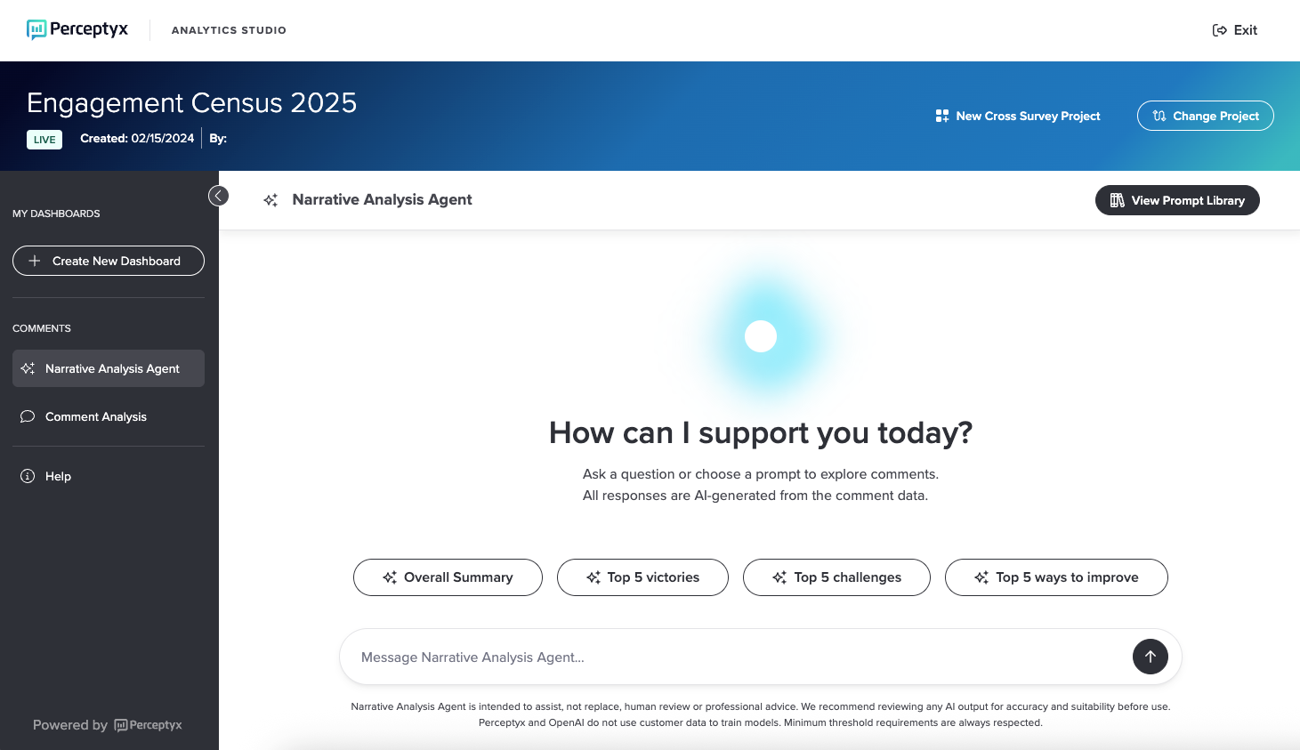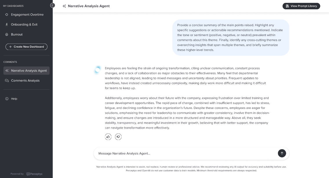 Note: Narrative Analysis Agent uses generative AI, which leverages OpenAI. When data is sent to OpenAI for analysis, no personal information or client identifiers are shared. Only the comment text and associated demographic attributes, specifically those visible in Analytics Studio, are included. For details about our approach to generative AI, please see the Perceptyx Perspective on Artificial Intelligence, Machine Learning, Natural Language Processing, and Generative AI article. Please note that Perceptyx does not train on customer data.