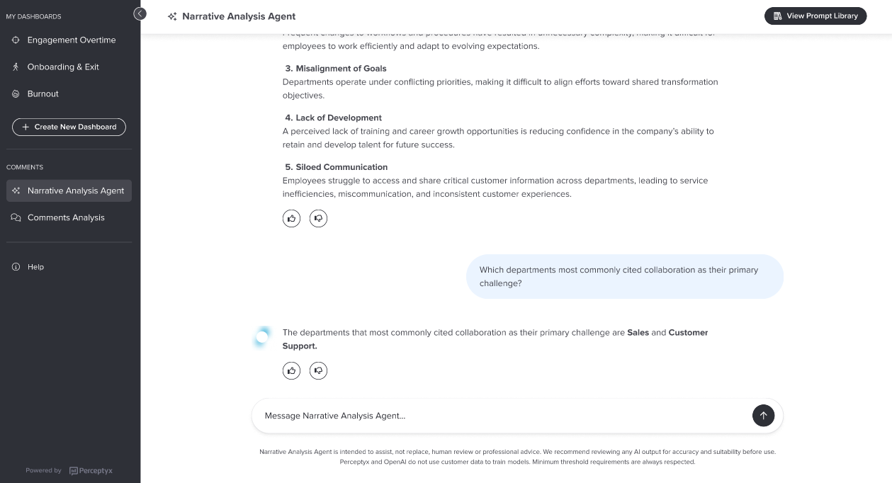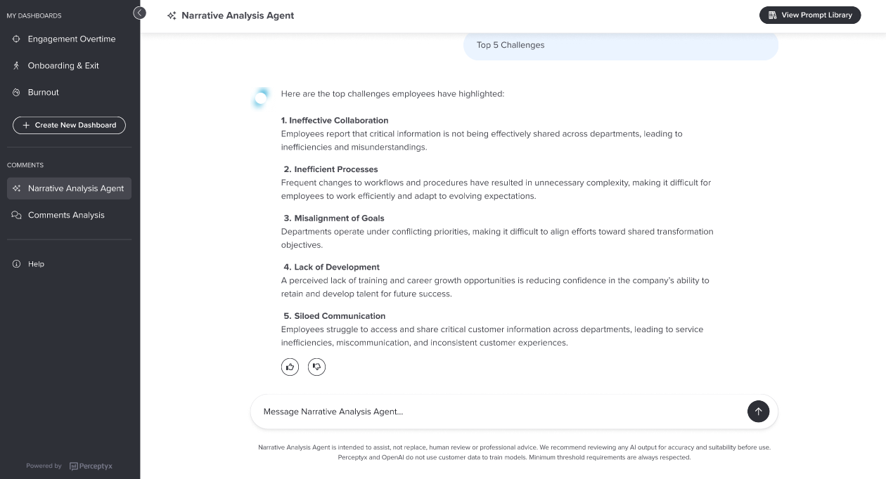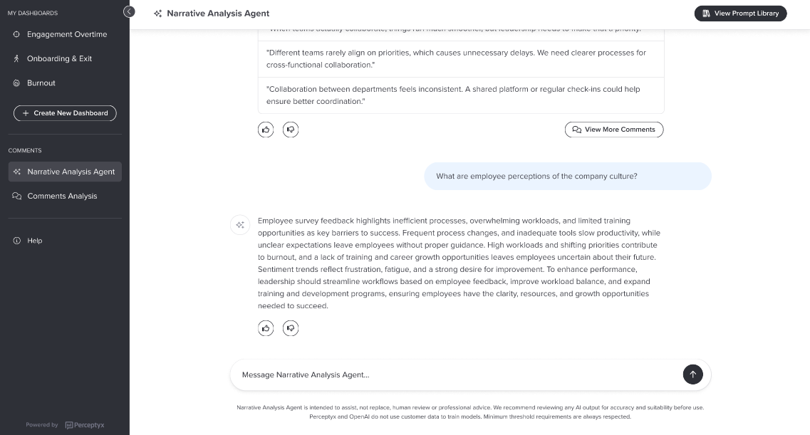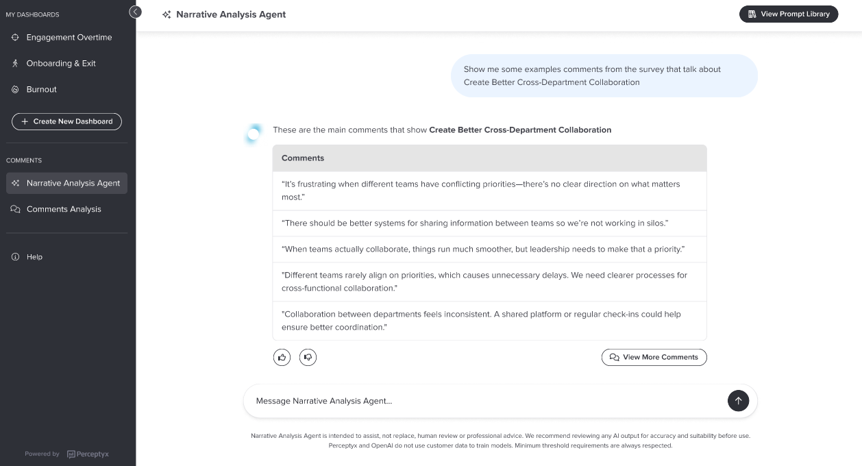 As you uncover insights, you can ask the Narrative Analysis Agent to surface specific examples (verbatim comments). You can open the Prompt Library at any time to apply any predefined prompt, without refreshing the page and losing your full conversation history.