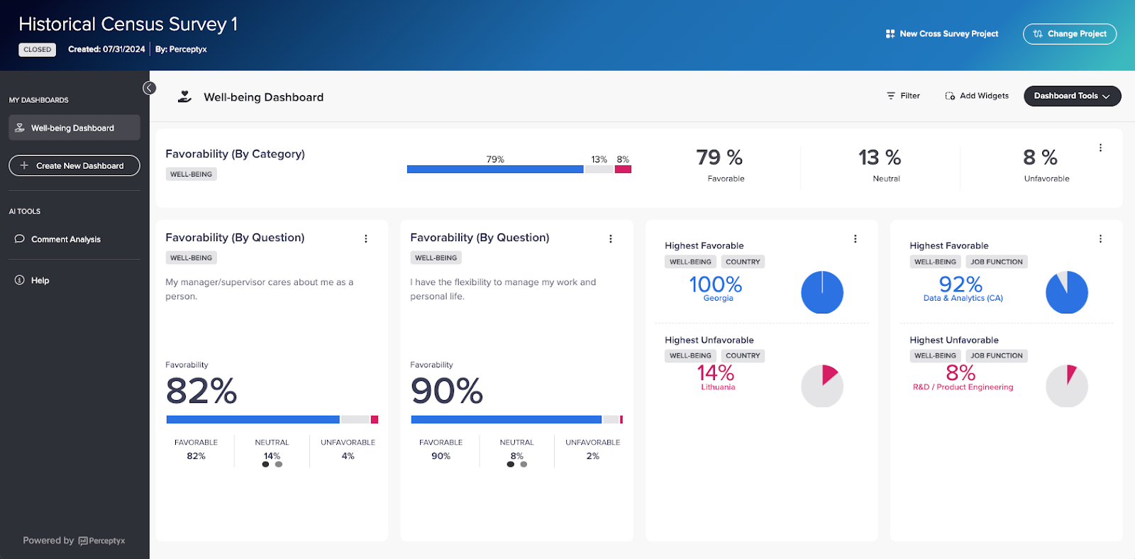 With the Cross Survey Project feature you can create custom dashboards with widgets from multiple listening events. Place widgets side by side to see results for a specific question or category across multiple events at a glance or use the Favorability Cross Survey Trend widget to view Favorability statistics over a period of time by question or category. Quickly see how experiences at key employee journey milestones affect measures like overall engagement, intent to stay, etc.
