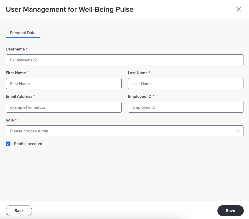 Enter the information for each required field (Username, First Name, Last Name, Email Address, and Employee ID).