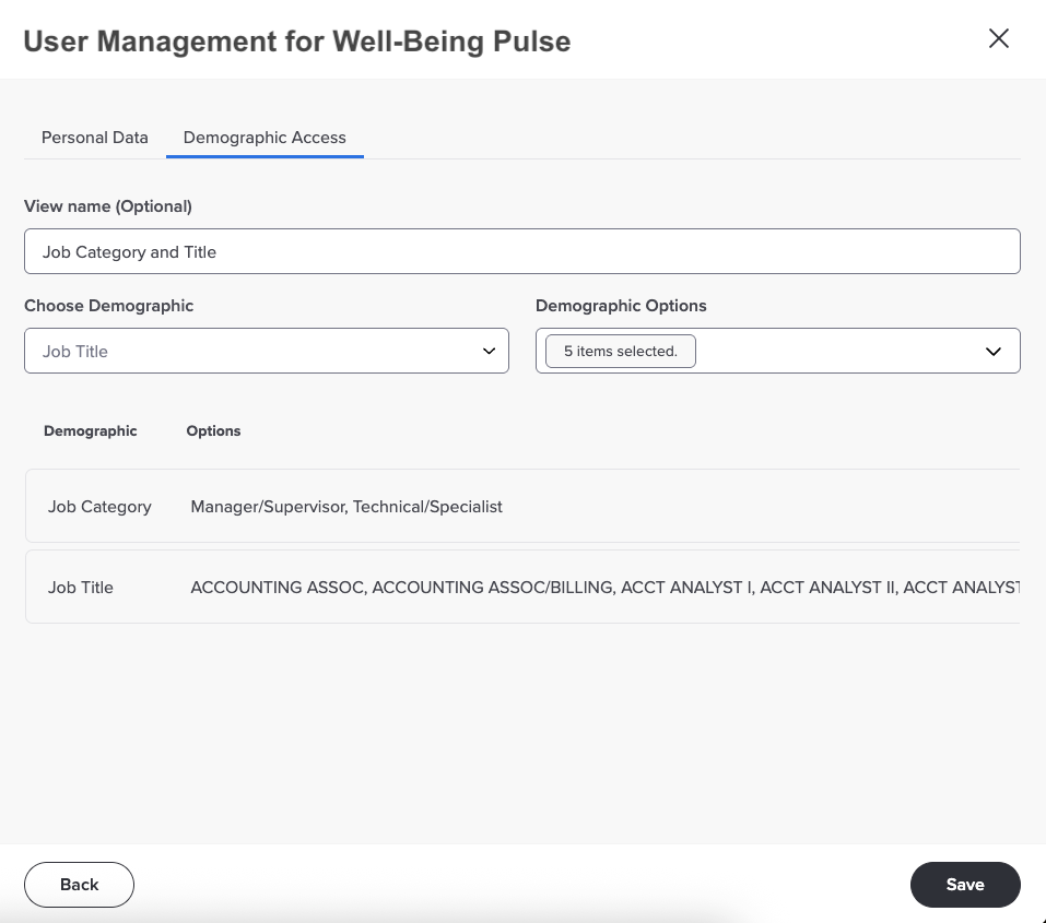 Use this tab to choose demographics and associated options from your data file. You can choose multiple demographics. You can also optionally specify a view name to describe the assigned demographic access.
