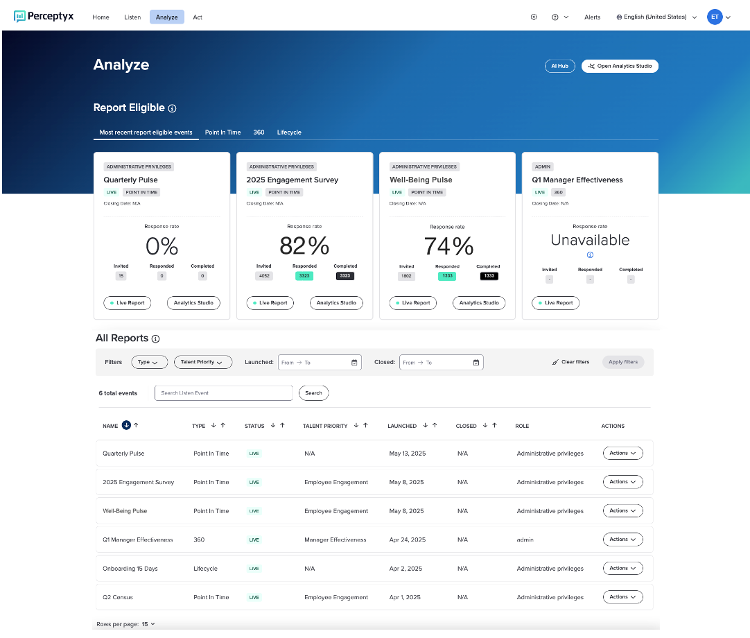 Depending on how recently reporting for a listening event became available, you can access results from the Report Eligible section or the All Reports section of the Analyze page.