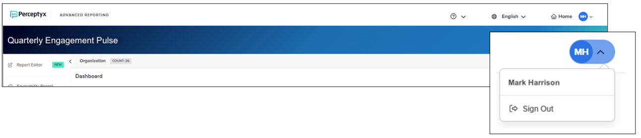To end both the reporting session and the platform session, click your initials in the top navigation bar and then click Sign Out.