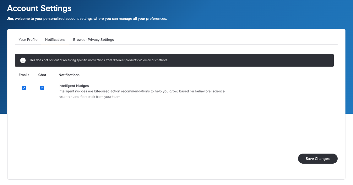 You can easily access your account settings from the platform navigation bar. You can view your profile information and view and edit your email and chat notification preferences and browser privacy settings.