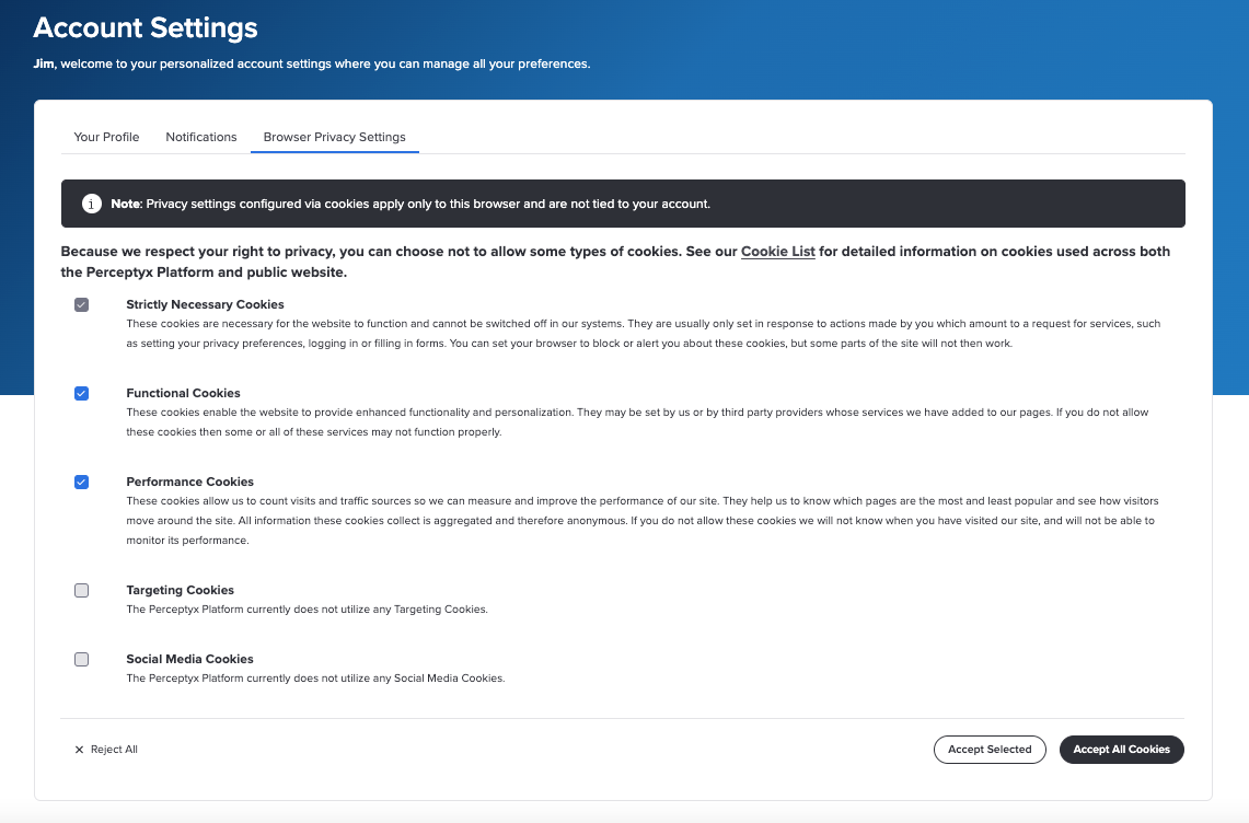 Note: The platform displays a prompt in the browser window when you access the platform. You can click Accept All Cookies to accept all cookies or click Cookie Settings to access the Browser Privacy Settings tab in your account settings. You can update your settings at any time.