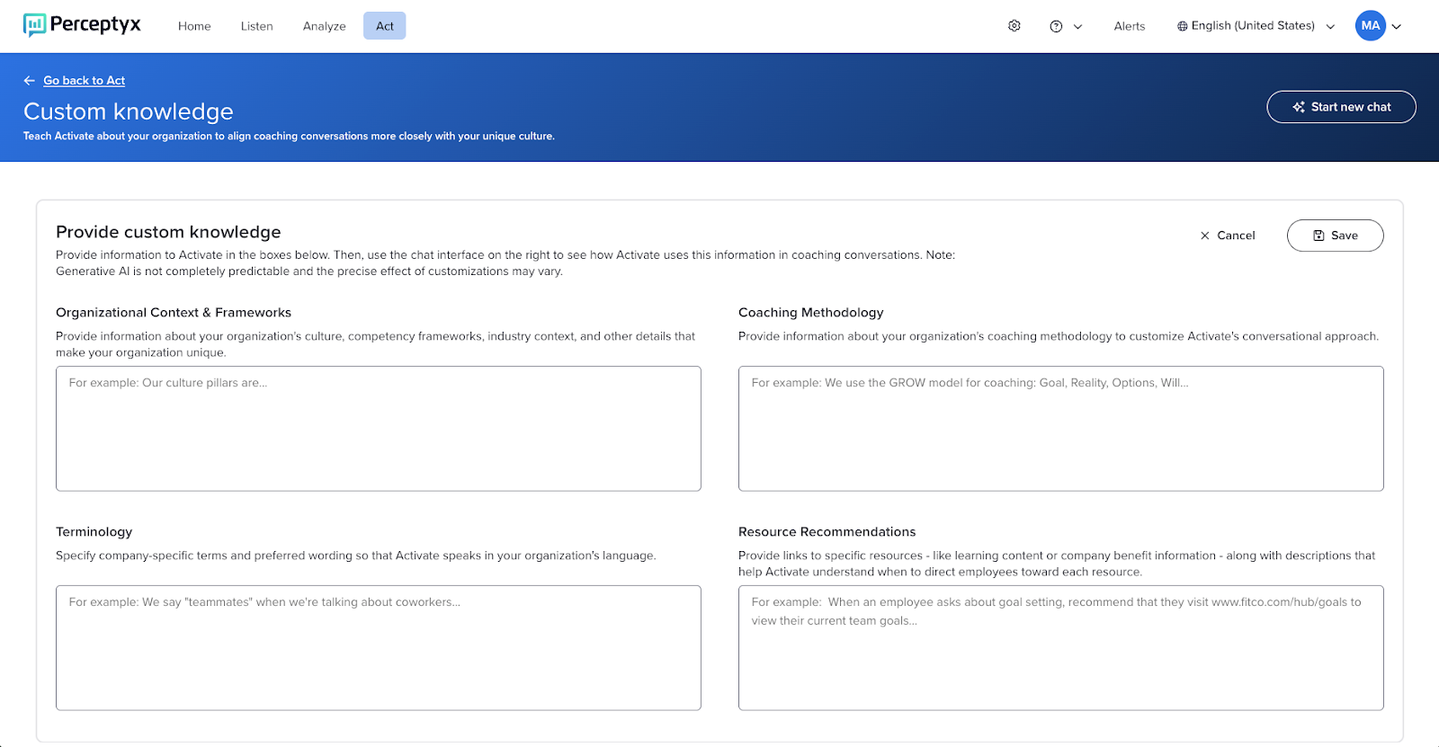 Administrators can assess how employees are engaging with and receiving support from AI Coach. The Act Metrics Dashboard displays aggregate data about how many employees engaged with AI Coach over the last 90 days and how many conversations were initiated.