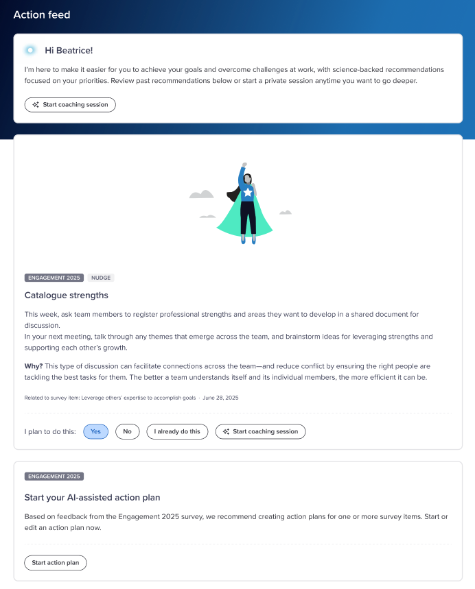 In the days following reporting access for a listening event, managers have access to AI-assisted action planning. A prompt in the Action Feed or in the flow of work (email, Teams, Slack, etc.) helps them start the process of creating an AI-assisted action plan.