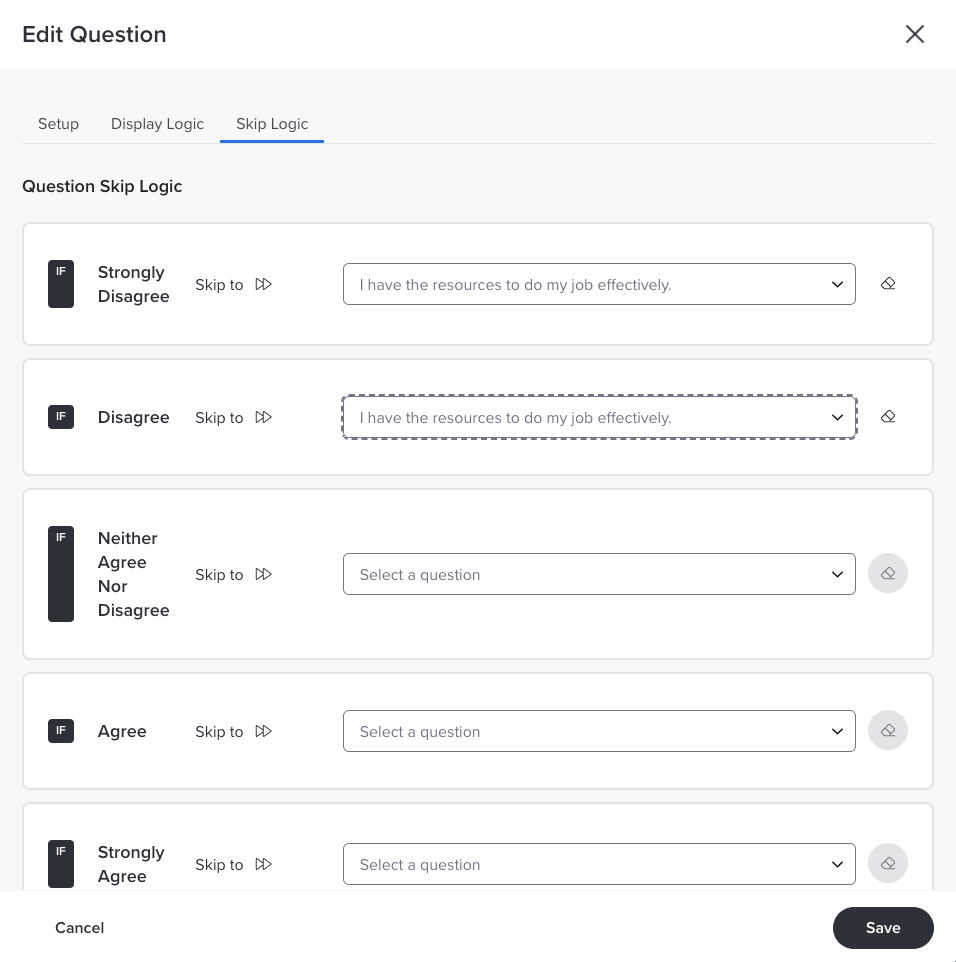 If a respondent answers Disagree or Strongly Disagree to a question about staying with the company, display logic can show a follow-up question asking what might encourage them to stay.