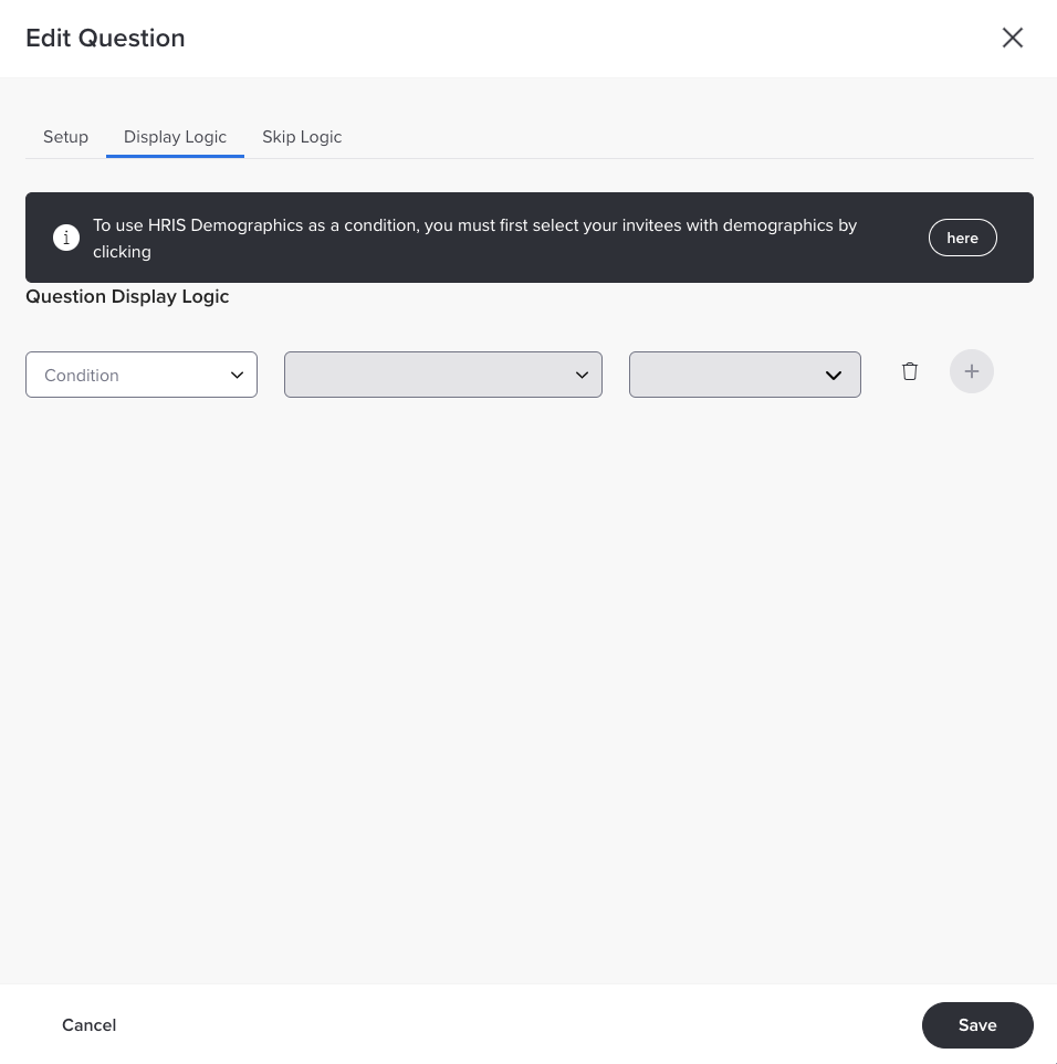 Note: Display logic cannot be applied to the first question in a survey, since the logic relies on earlier responses or demographic selections.