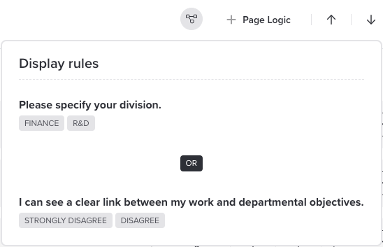In the example above, the questions on page 2 will display if a respondent answers Finance or R&D for the demographic question “Please specify your division” OR answers Disagree or Strongly Disagree for the survey question “I can see a clear link between my work and departmental objectives.”