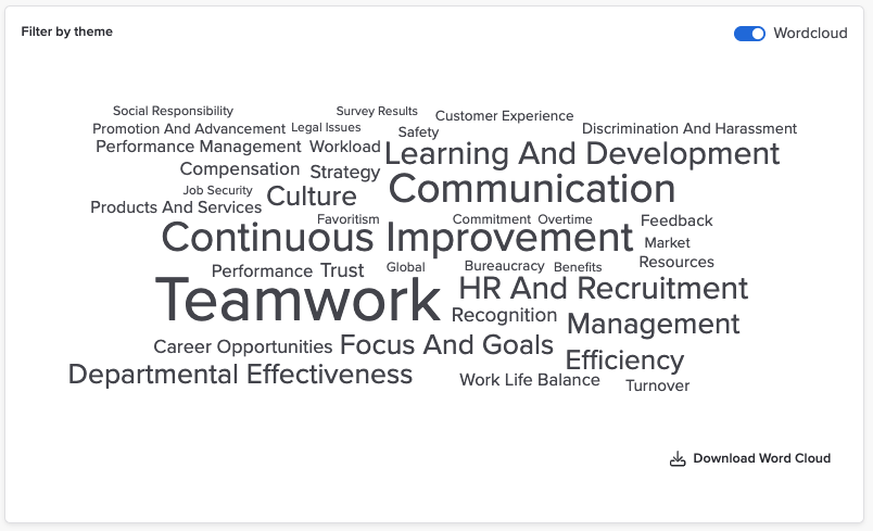 You can also filter by theme using a word cloud. Enabling the Wordcloud toggle switches the theme list to a word cloud in which each word represents a theme.