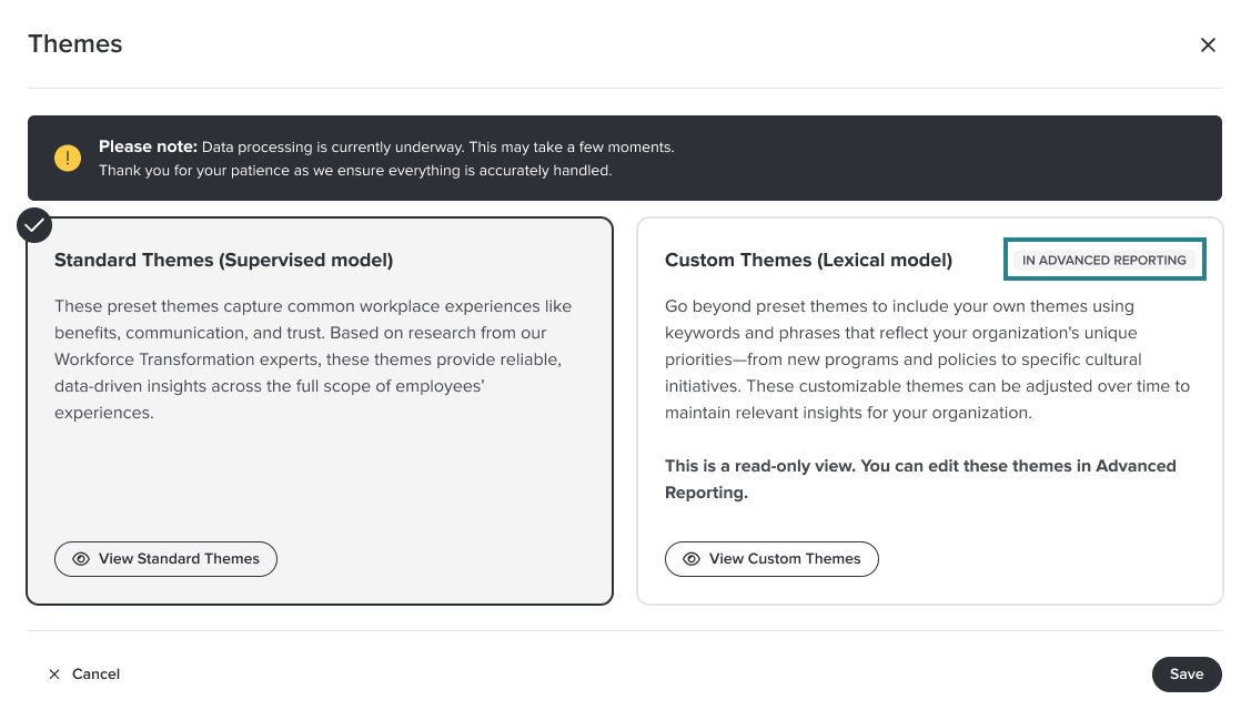 Standard (a.k.a. Supervised): A standard set of pre-built themes, based on research by Perceptyx Workforce Transformation experts, that capture common workplace experiences such as benefits, career opportunities, trust, etc.