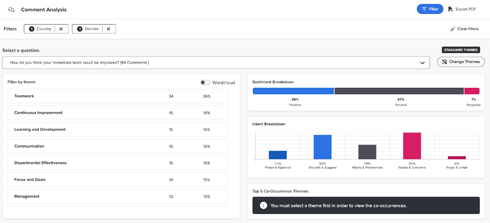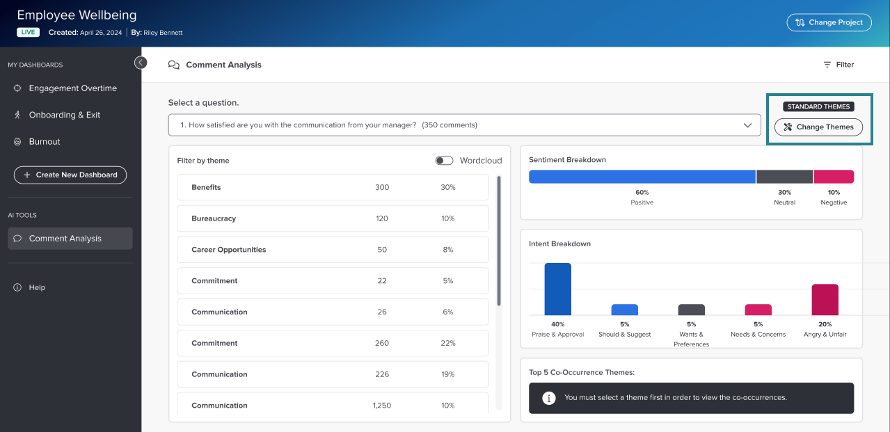 The Top 5 Co-Occurrence Themes section displays sub themes in the comments related to a specific theme you select. When you select a theme, the comments within it include other themes as well. The themes that appear in this section are the ones that most frequently appear with the selected theme. For example, when comments mention leadership, they also tend to include the communication theme.