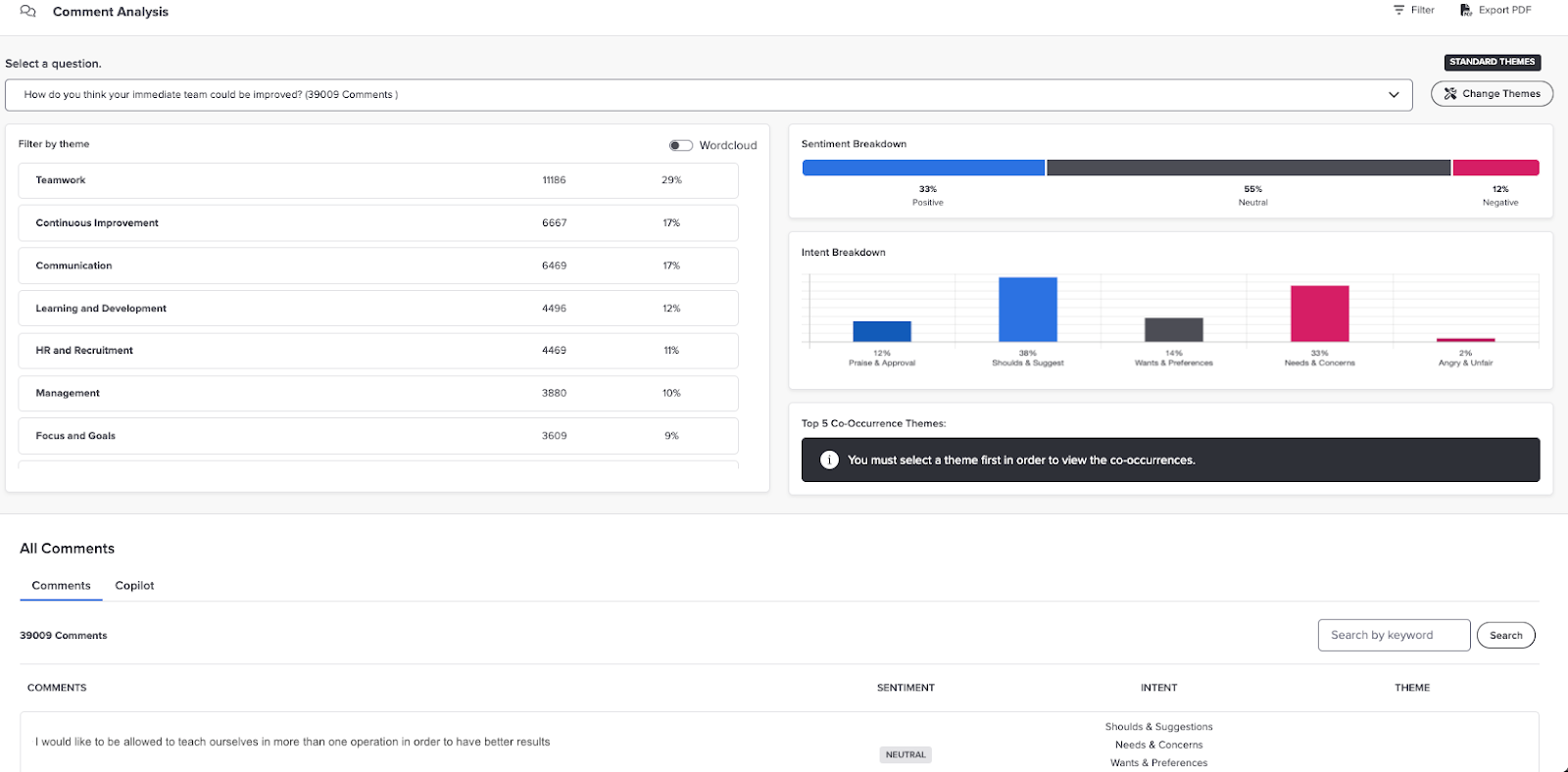 The themes, sentiment and intent breakdowns, and co-occurring themes for the selected question appear in the upper half of the workspace. All the comments for the selected question appear in the All Comments section (in the lower half of the workspace).