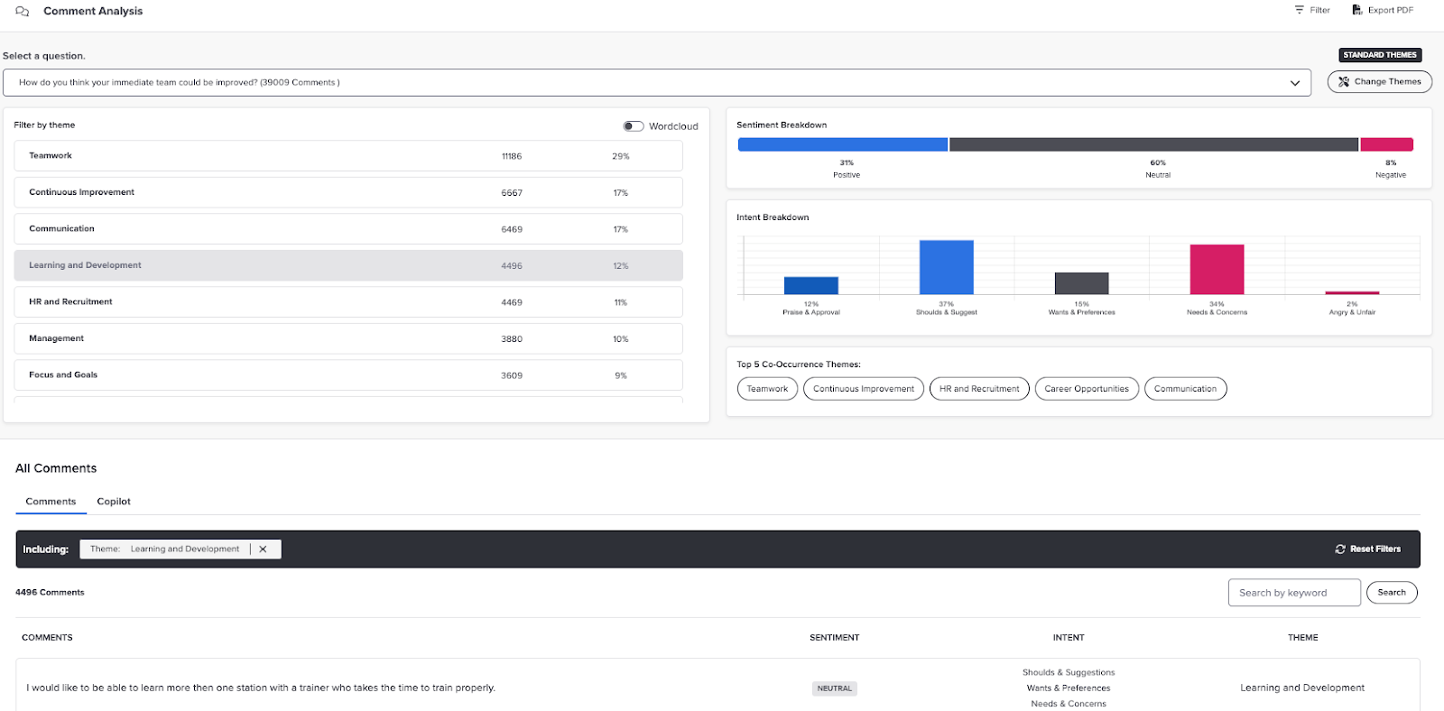 The second screen capture shows the Learning and Development theme applied. Notice that the Sentiment Breakdown and Intent Breakdown percentages are different, and Co-Occurrence Themes now display. In the All Comments section, the number of comments is reduced from 39,009 to 4,496 and the selected theme displays in the Theme column.