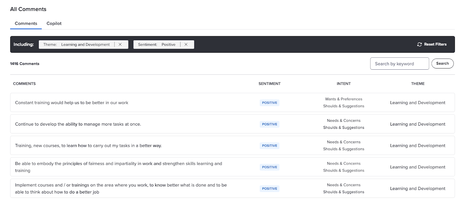 The following example shows the Positive sentiment applied in addition to the Learning and Development theme. Notice that the number of comments is further refined to 1,416 and the only sentiment shown is Positive.