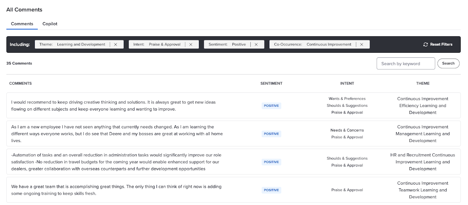 The following example shows the Continuous Improvement subtheme applied in addition to the Praise & Approval intent, the Positive sentiment, and the Learning and Development theme. Notice that the number of comments is further refined to 35 and the Theme column includes Continuous Improvement sub themes in addition to the Learning and Development theme.
