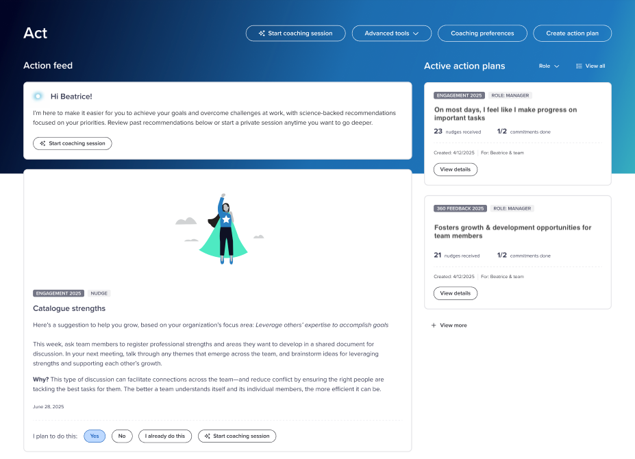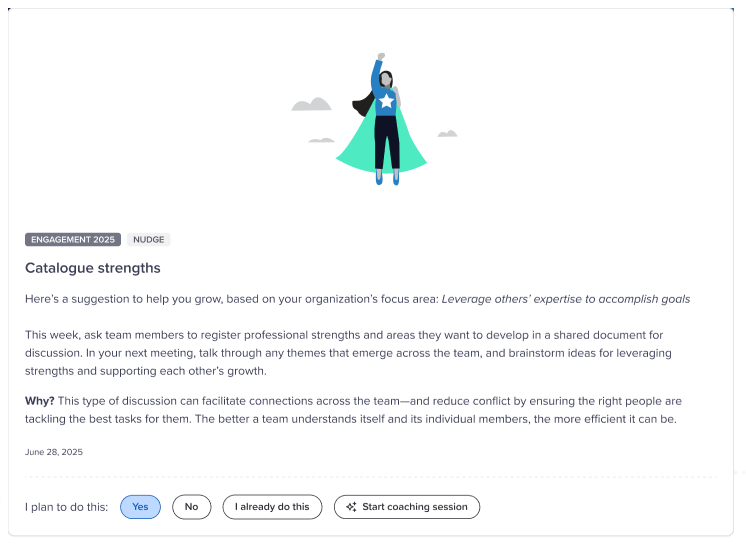 Intelligent Nudges: Science-backed, personalized coaching suggestions that drive follow-up on action plans or other priorities within the flow of work.
