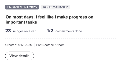 Administrators can also temporarily boost nudges aligned to a specific theme and to a specific audience in response to emerging organizational needs revealed in listening data or upcoming events impacting the organization. For details, see the Add and Manage Nudge Boosts (Admins Only) article.
