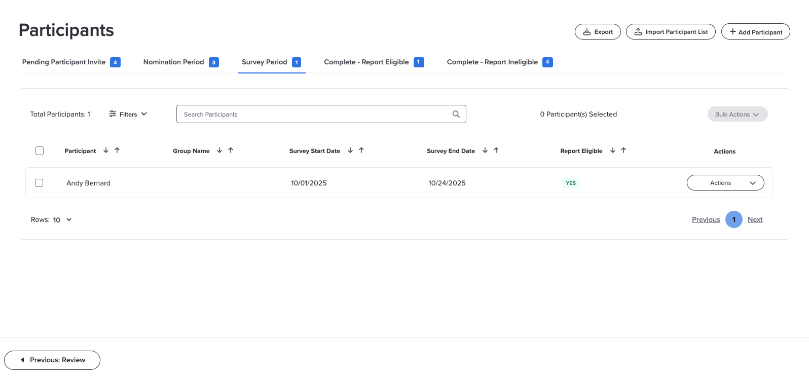 During the survey period, raters are completing their assessments of the participants and, if Self is included in the event relationships, the participants are completing their self-assessments. Participants who are in the survey period appear on the Survey Period tab of the Participants page. You can search and filter the list of participants and take actions to help encourage participation so each participant is eligible to receive a report.