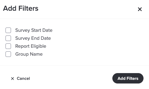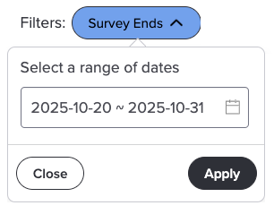 If filtering by the survey start or end date, click the dropdown for the filter, click the Select a Range of Dates box, and then use the calendar popup to specify a date range for the filter.