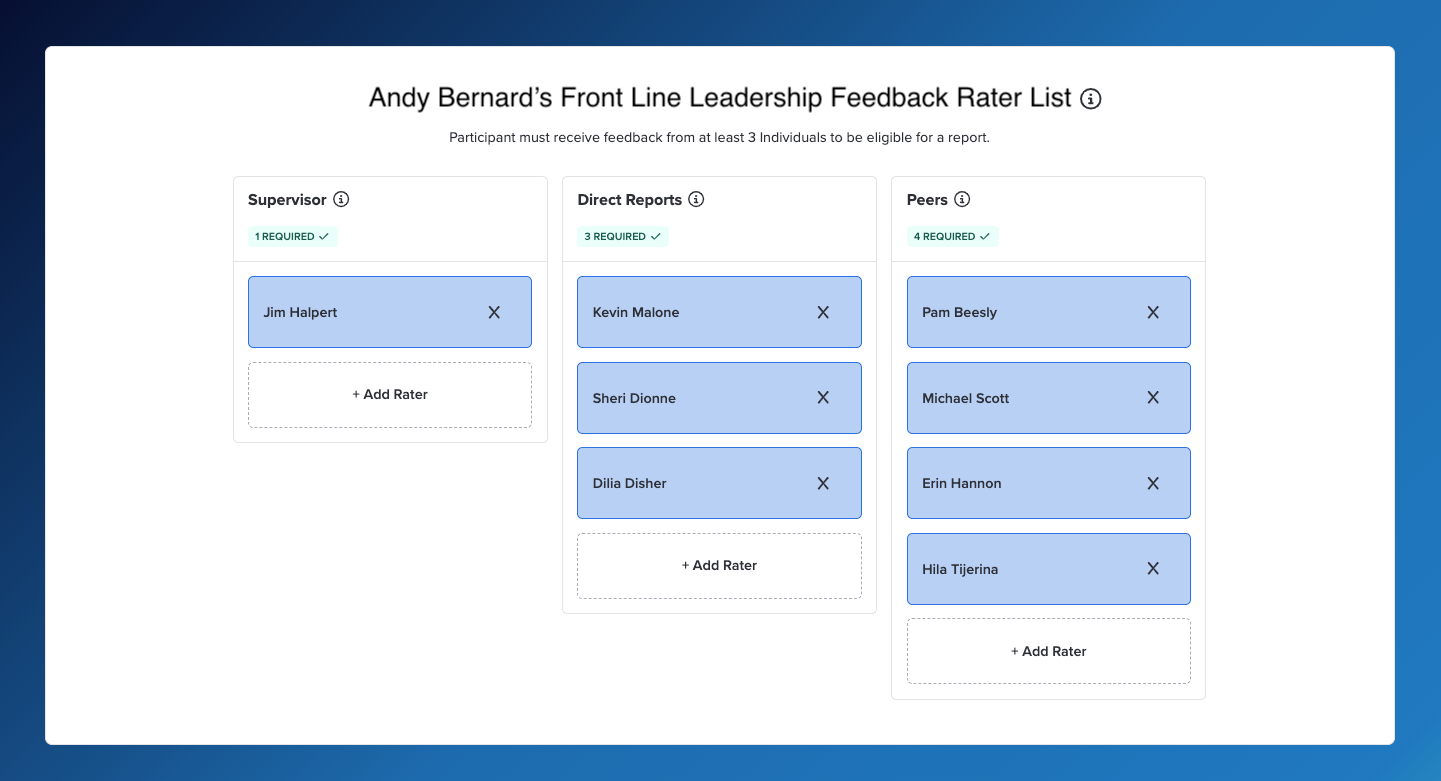 Adding or editing raters for a participant can help improve their chances of receiving enough responses to be report eligible.