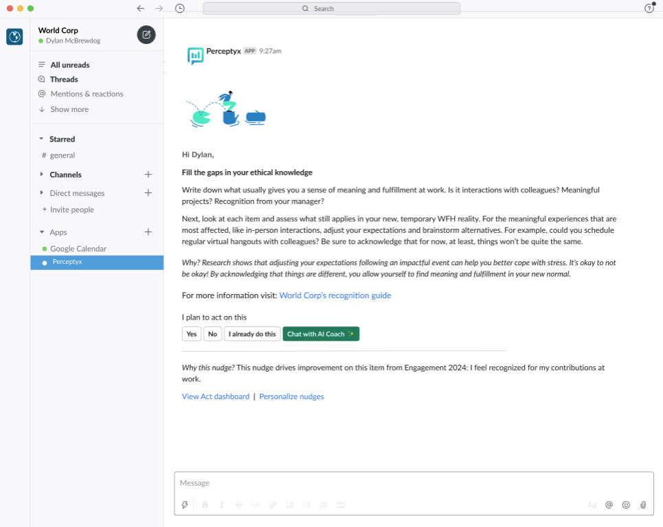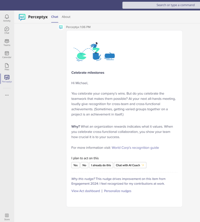 All nudges include the Action options, which provide valuable feedback Perceptyx uses to continuously improve their relevance and effectiveness.