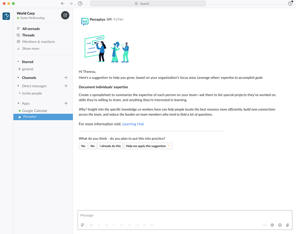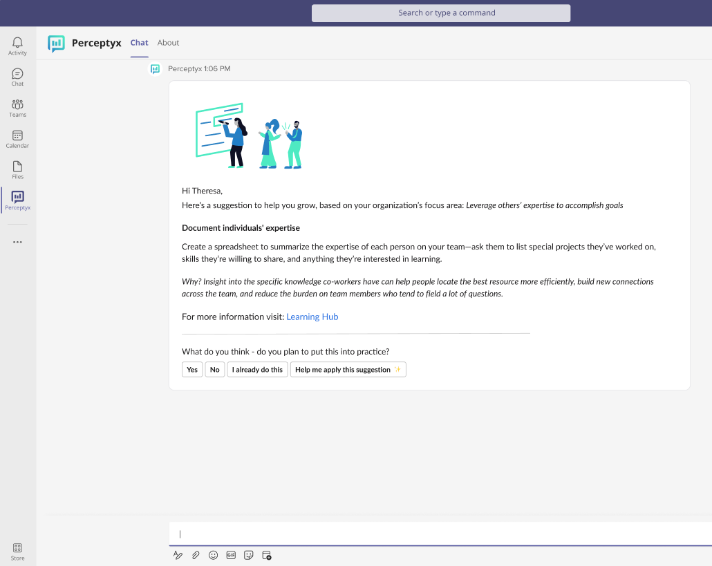 Designed to augment action plans as well as help individuals reach personal goals, nudges are delivered seamlessly in the flow of work, making them quick and easy to implement. As employees interact with Intelligent Nudges, they can provide feedback that Perceptyx uses to refine our nudges over time and make them more targeted and personalized.