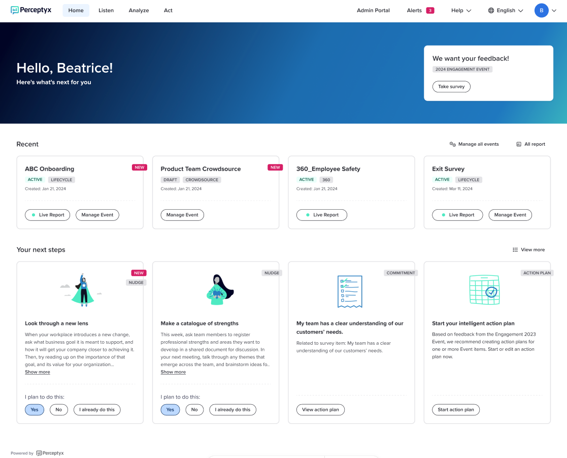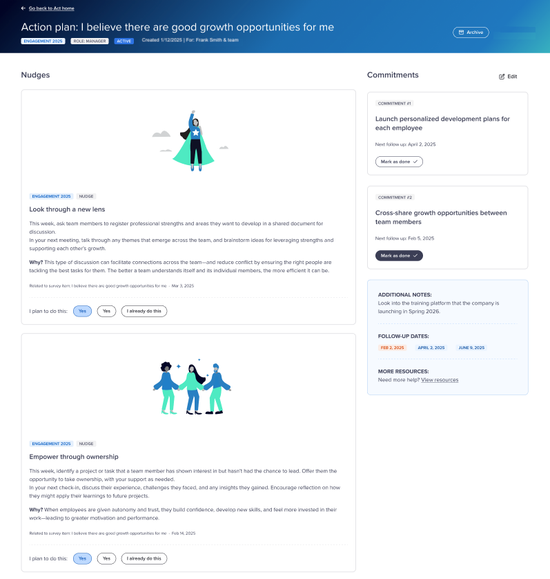 Nudges are personalized, science-backed action recommendations—powered by AI and delivered in the flow of work—that help employees turn insight into impact. Whether generated for organization-wide listening events or 360 feedback results, nudges guide individuals toward small, meaningful actions that drive positive behavior change and lasting business results.