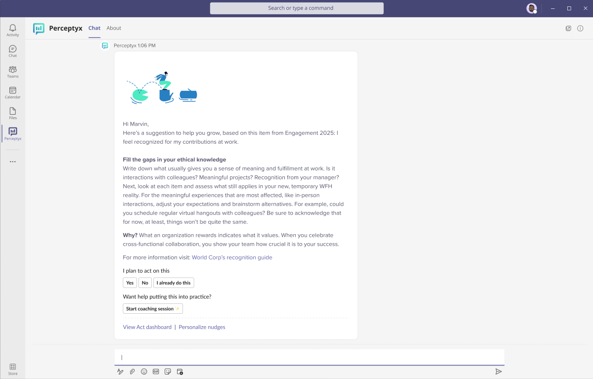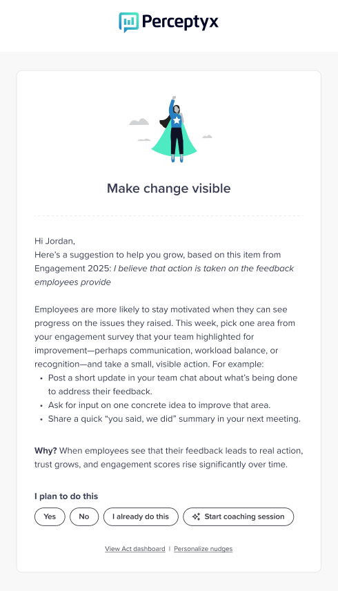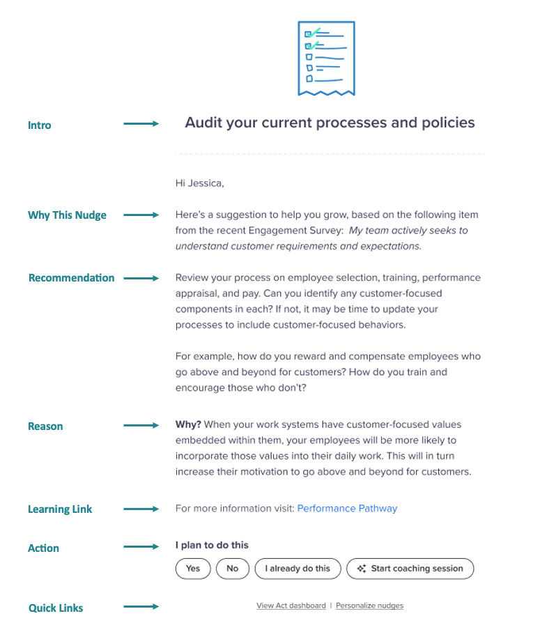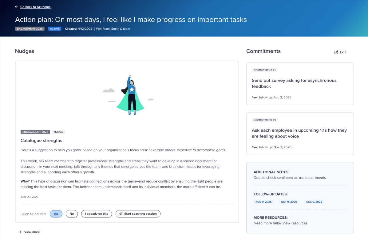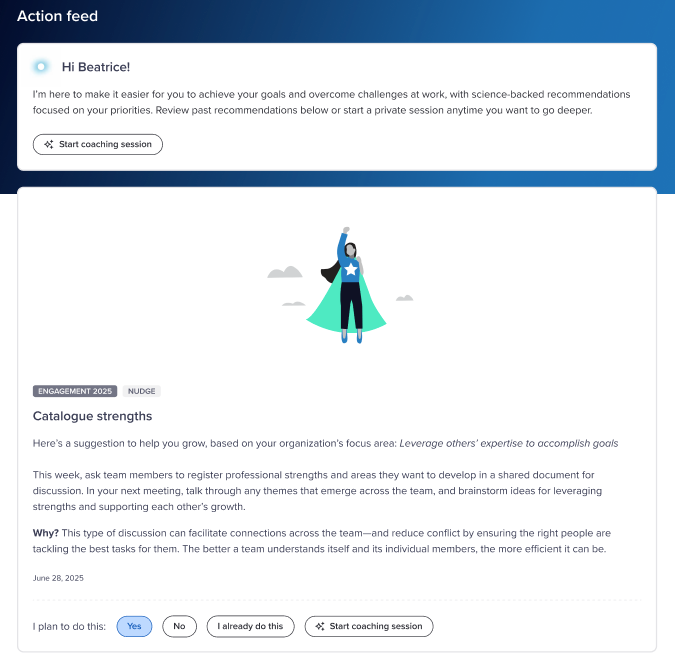 Each week, Activate delivers a nudge based on your action plan commitments, your organization’s focus areas, or personal focus area inputs you’ve provided.