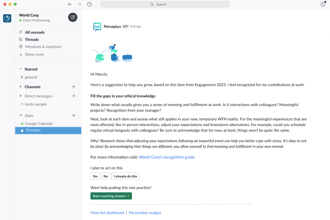 Action: Measures your commitment to act. You can select Yes, No, or I already do this. You can also start an on-demand coaching session to get personalized support.