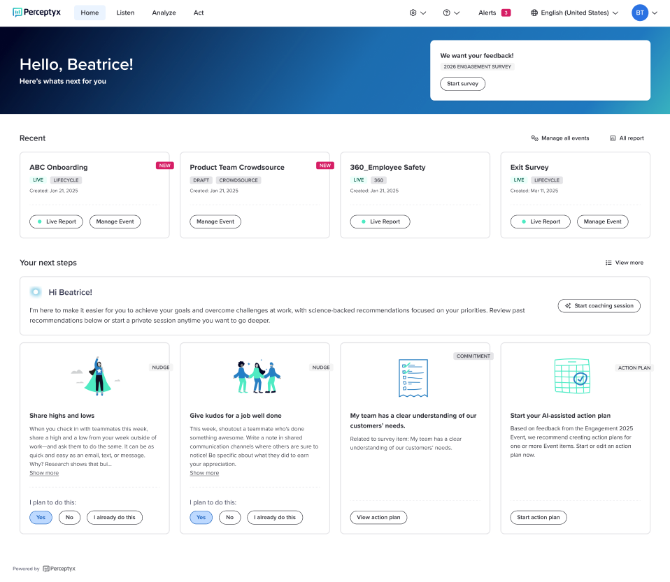 Nudges are personalized, science-backed action recommendations powered by AI and delivered by the Activate agent directly in the flow of work. Whether generated from organization-wide listening events or 360 feedback results, nudges help employees turn insights into small, meaningful actions that drive measurable behavior change and lasting business impact.